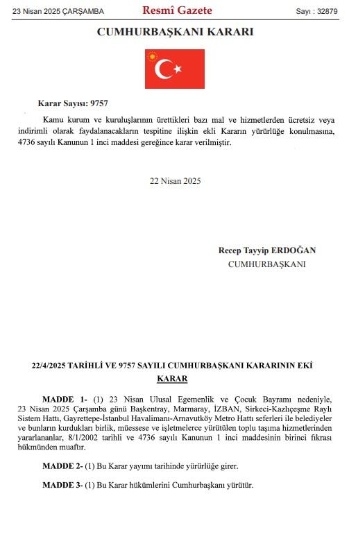 23 Nisan Ulusal Egemenlik ve Çocuk Bayramı kapsamında toplu taşıma araçlarının ücretsiz olacağı duyuruldu. Cumhurbaşkanı Recep Tayyip Erdoğan’ın imzasıyla Resmi Gazete’de yayımlanan karara göre, vatandaşlar 23 Nisan 2025 Çarşamba günü belirli toplu taşıma hizmetlerinden ücretsiz yararlanabilecek.