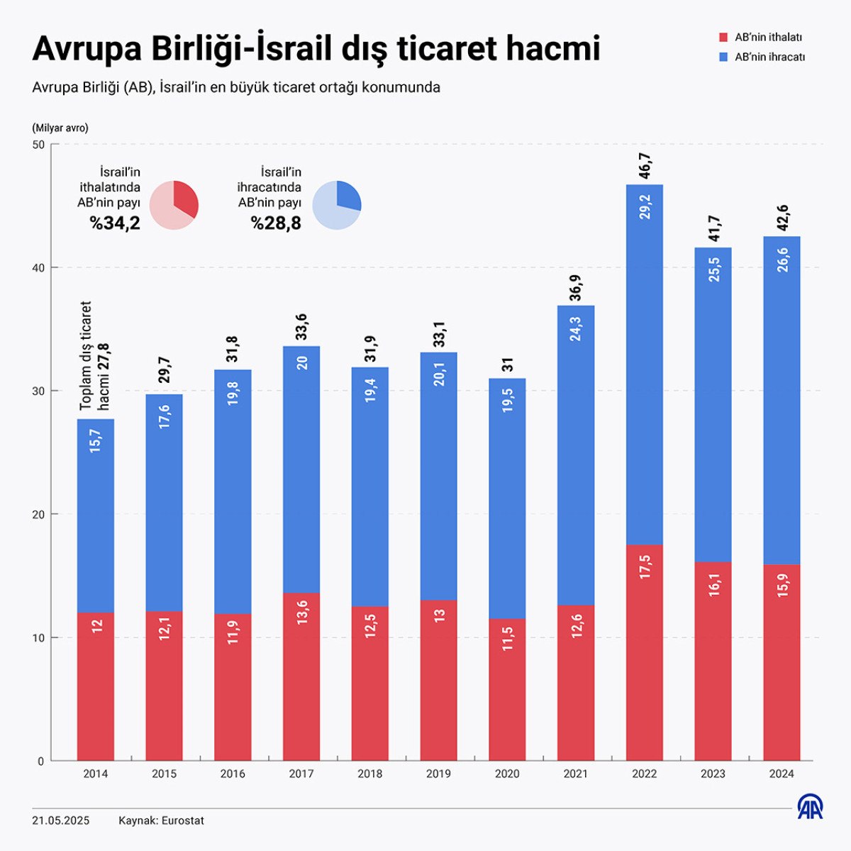 Eurostat verilerine göre 2024’te İsrail, AB’den 15,9 milyar euroluk ihracat yaparken, 26,6 milyar euroluk ithalata da imza attı.