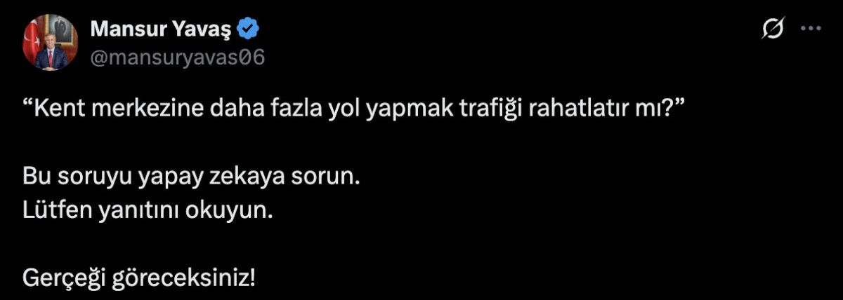 Ankara Büyükşehir Belediye Başkanı Mansur Yavaş, bir yandan konserlere milyonlarca lira harcarken, diğer yandan bu iki beton direğe 2.2 milyar TL harcamasıyla eleştiriliyor. Öte yandan, Ankara’nın trafik sorununa çözüm üretmemesi konusunda daha önce yaptığı “yapay zekâ” savunması da yeniden gündeme geldi. Yavaş, şehir merkezine yol yapmanın trafiği rahatlatıp rahatlatmayacağının yapay zekaya sorulması gerektiğini söylemişti.