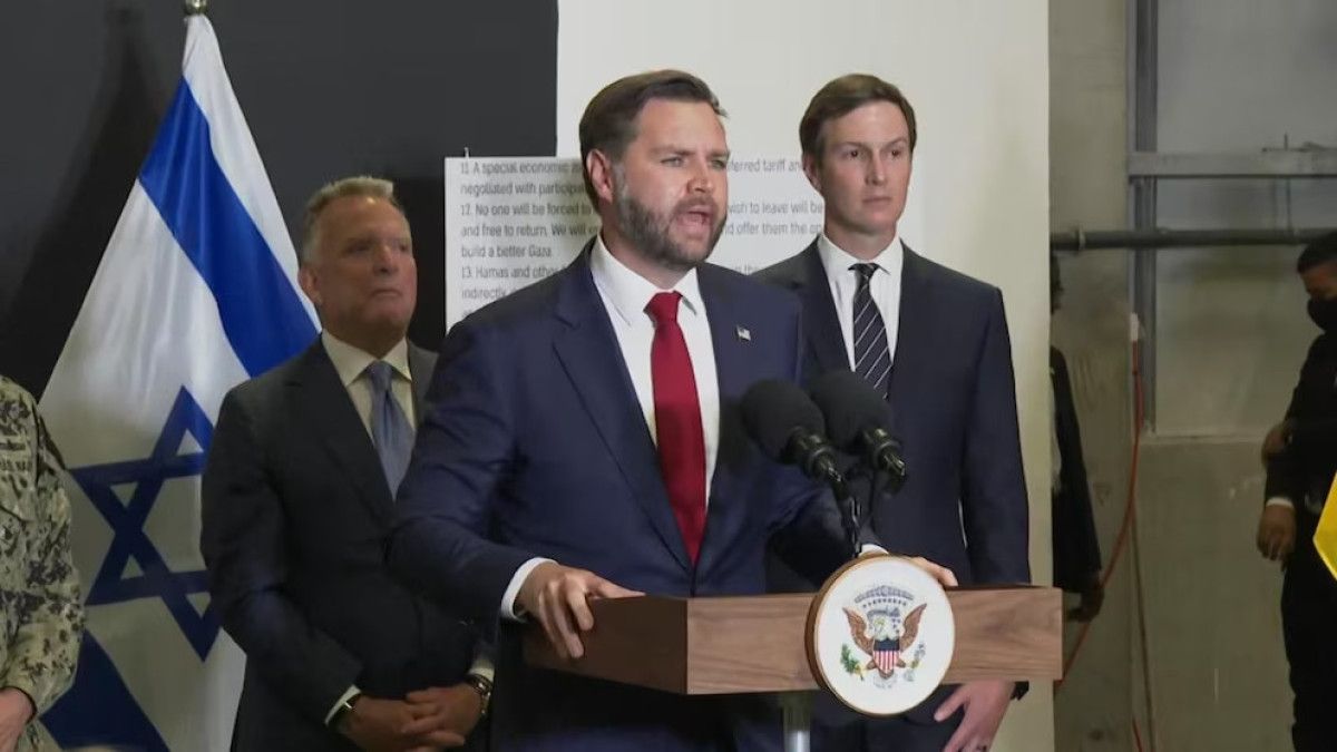 ABD Başkan Yardımcısı J.D. Vance, ABD Başkanı Donald Trump’ın Orta Doğu Özel Temsilcisi Steve Witkoff ve damadı Jared Kushner, İsrail’deki temasları sonrasında ABD ve İsrail’in Gazze Şeridi’ndeki ateşkesin uygulanması ve gözetimi için kurduğu merkezde basın toplantısı düzenledi.