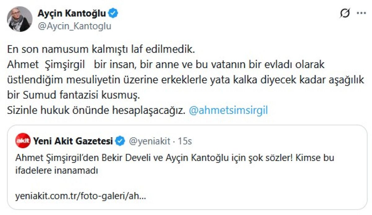 En son namusum kalmıştı laf edilmedik. Ahmet Şimşirgil bir insan, bir anne ve bu vatanın bir evladı olarak üstlendiğim mesuliyetin üzerine erkeklerle yata kalka diyecek kadar aşağılık bir Sumud fantazisi kusmuş. Sizinle hukuk önünde hesaplaşacağız.