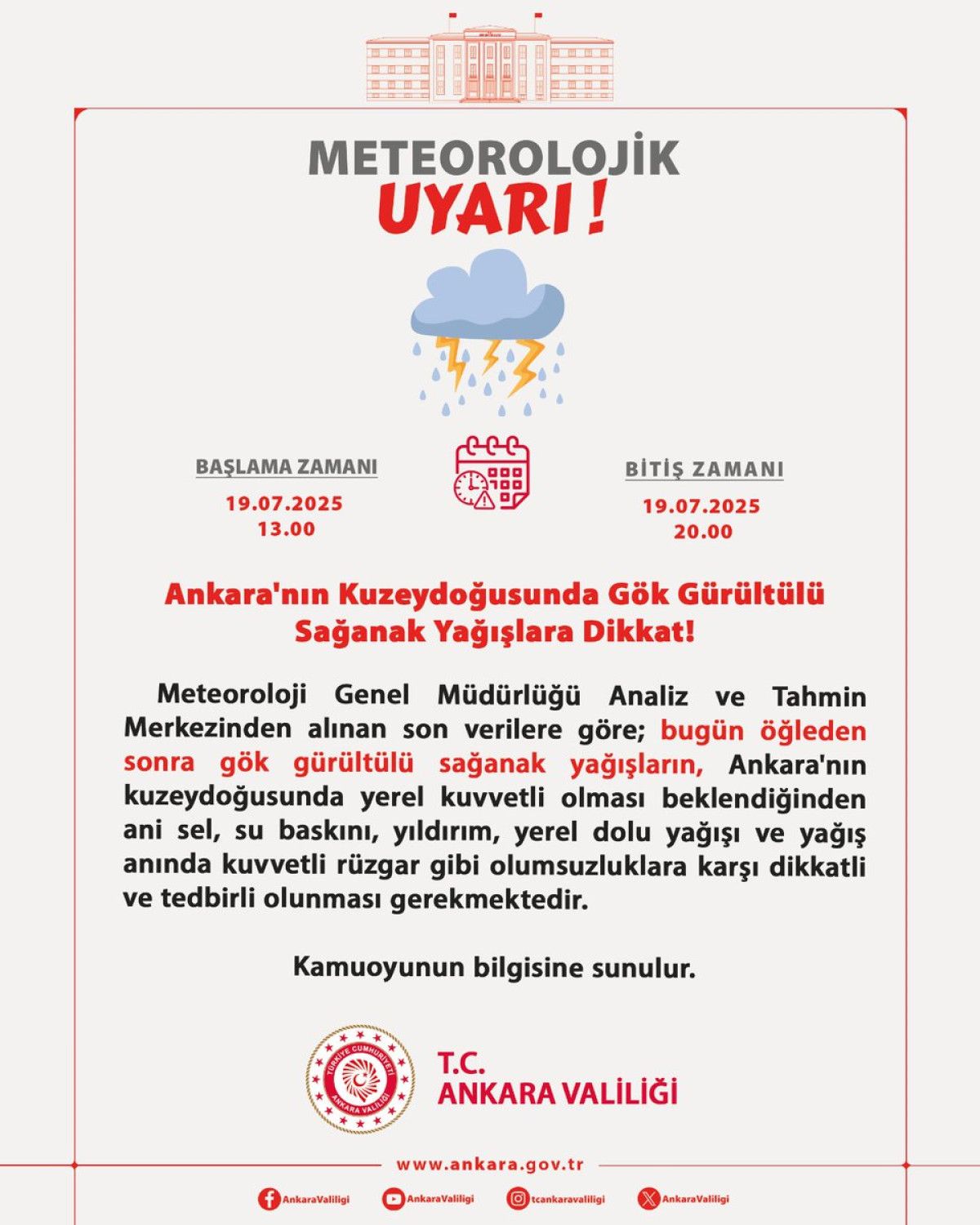 Sevgili Ankaralılar; Meteoroloji’nin son değerlendirmelerine göre bugün 13.00 – 20.00 saatleri arasında ilimizde kuvvetli gök gürültülü sağanak yağış beklenmektedir. Su baskını, ani rüzgar ve ulaşımda aksamalar gibi risklere karşı tüm ekiplerimiz teyakkuz halindedir.