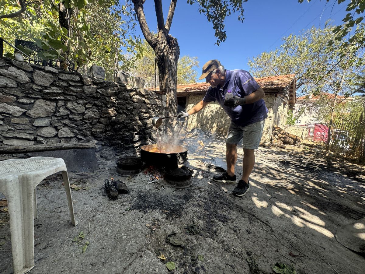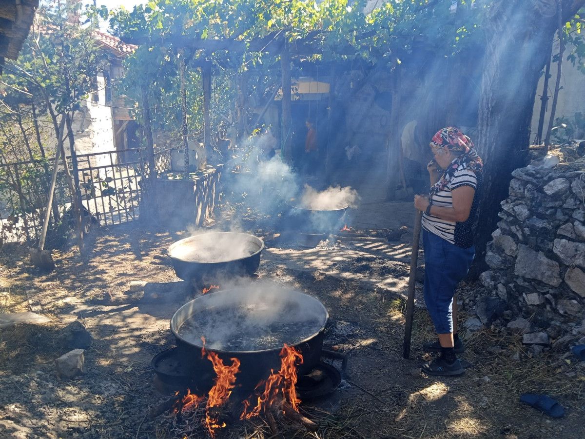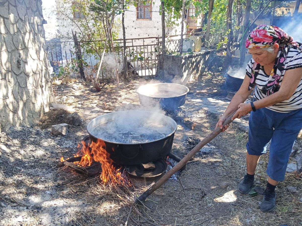 Doğal üretimin göstergesi olarak arıların bile pekmeze ilgi gösterdiğini söyleyen Gümüş, “Doğal olduğu için arılar geliyor. Doğal olmasa zaten gelmezler. Üzümümüzü sıktık, külü koyduk, pekmezimizi yaptık. Afiyetle yiyeceğiz” dedi.