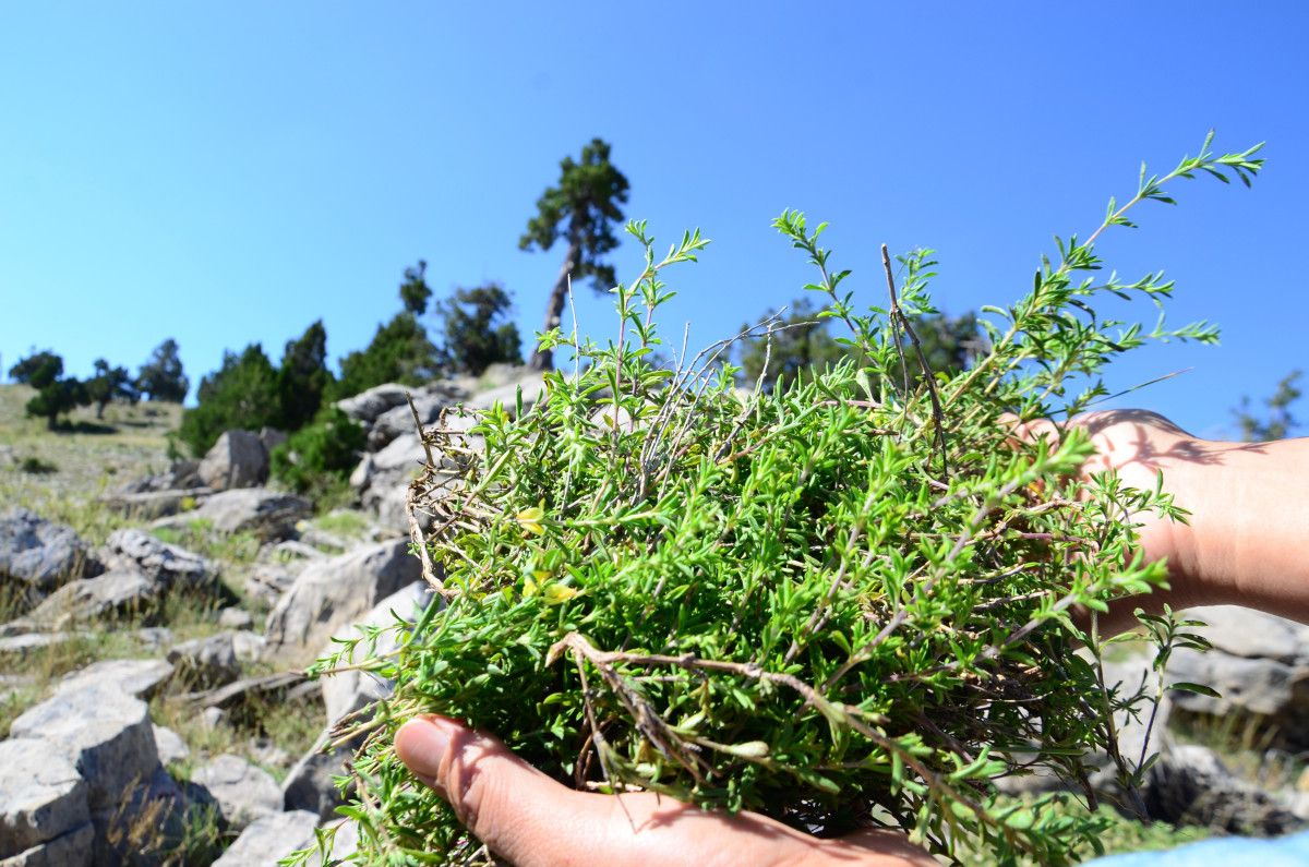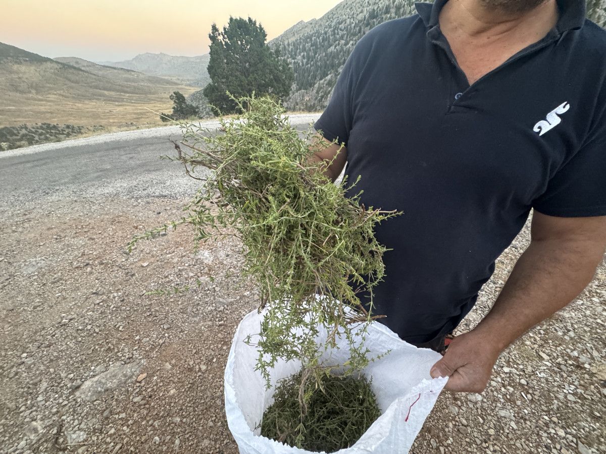 Yüksek rakımlı Göktepe Yaylası’nda taşların arasından çıkan kekikleri toplayarak kışın yemeklerde ve hastalıklarda içecek olarak kullandıklarını belirten Çatlı, “Taş kekiği ismi gibi taşların arasında oluşur. Buranın rakımı bin 800 metredir. Bazı vatandaşlar kekiğin bağını 10 liraya satıyorlar.