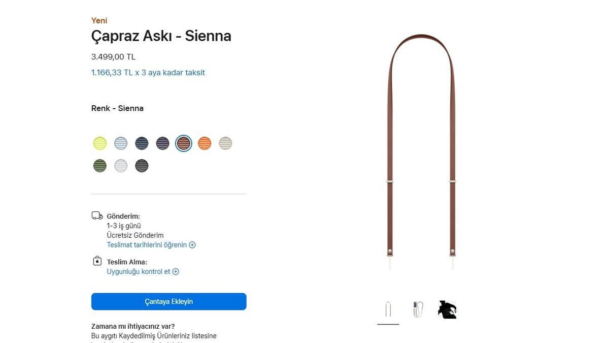 Toplam 10 farklı renk seçeneğiyle satışa sunulan yeni Çapraz Askı aksesuarı, 3 bin 499 TL’lik fiyat etiketiyle Apple’ın resmi sitesinde yerini aldı.