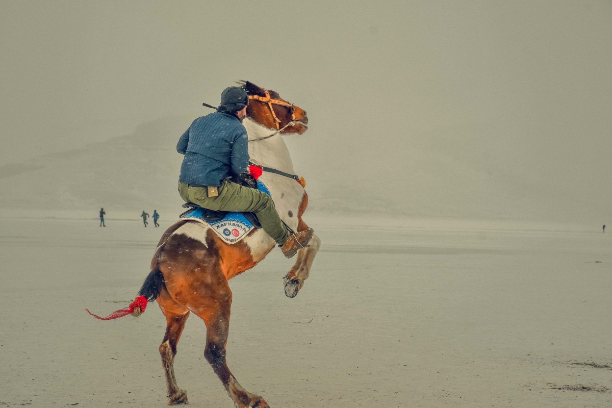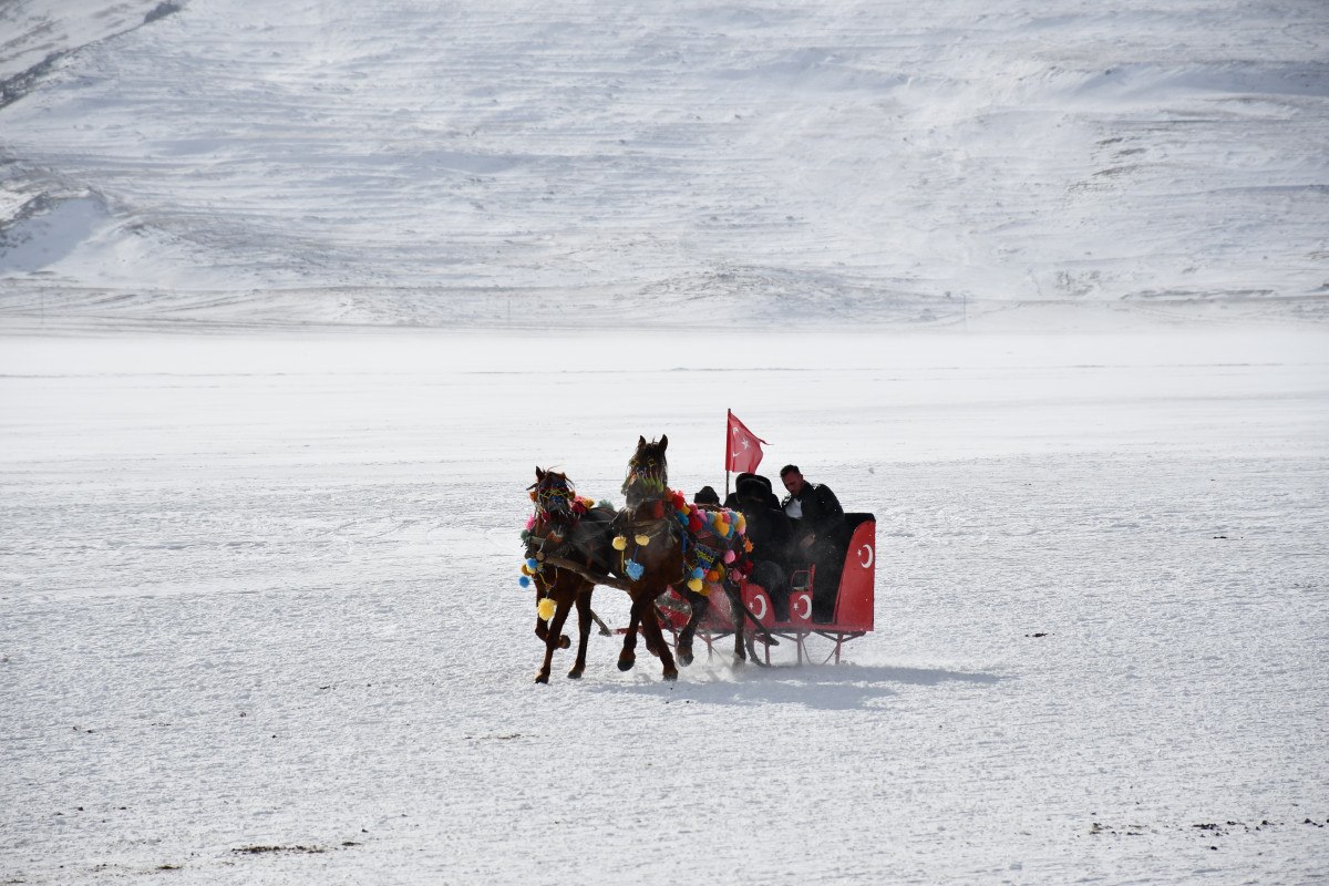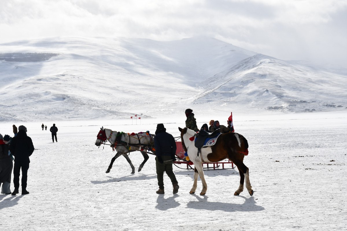 Çıldır Gölü’nün buz tutan yüzeyinde atlı kızak etkinlikleri düzenlenmeye başlandı.