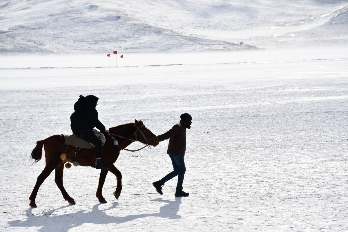 Gölün buz tutmasıyla turistler için yeni bir etkinlik fırsatı doğdu.