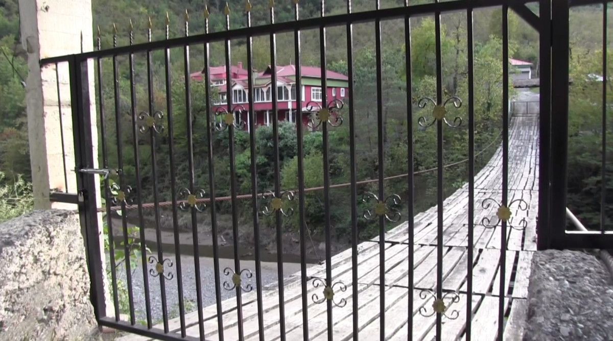 Derenin karşı yamacında Güner ailesine ait 6 eve ulaşımı sağlayan asma köprü demir kapılı ve çatılı görünümüyle dikkat çekiyor.