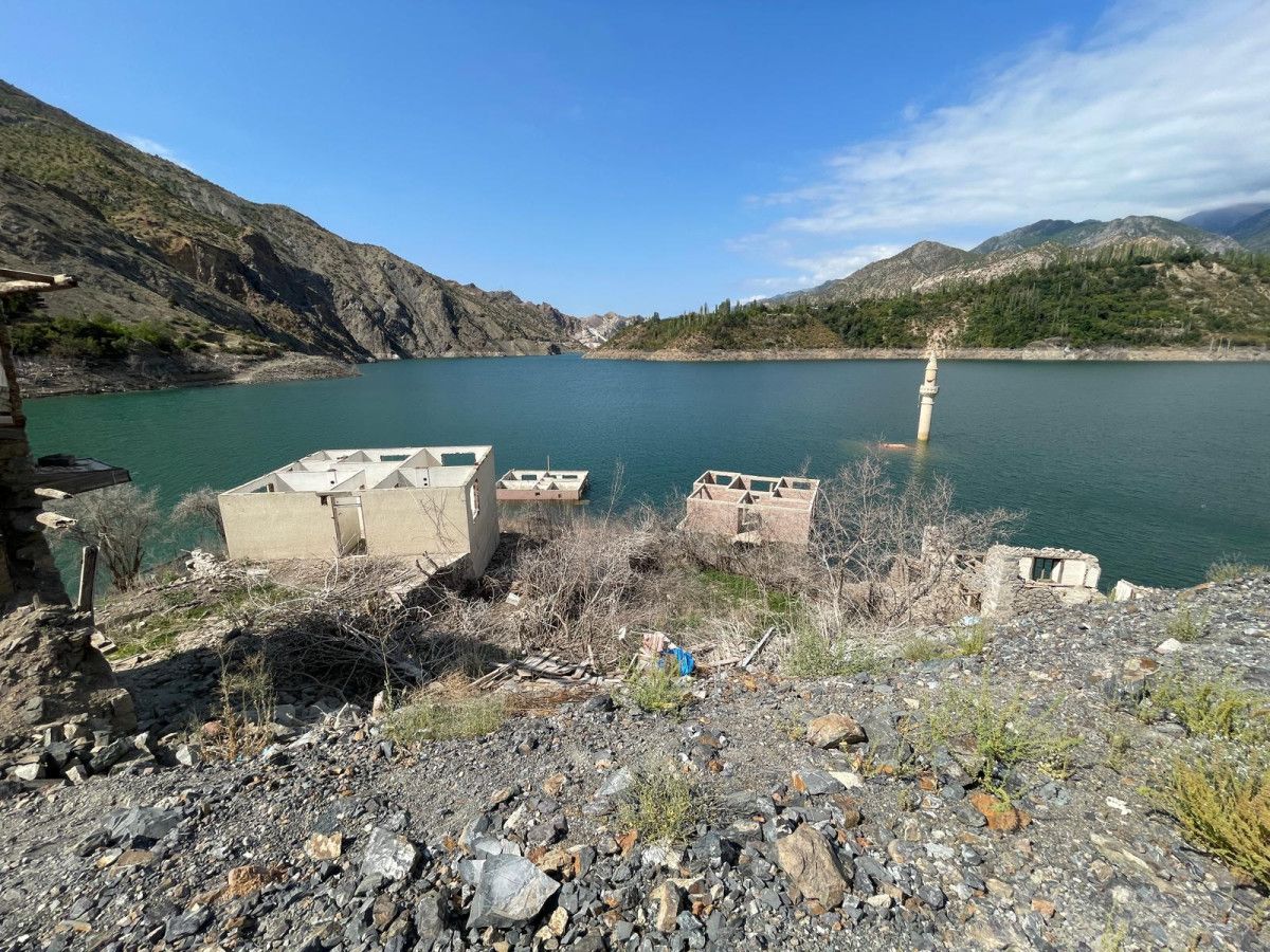 Baraj suyunun, bazı yerlerde çekilmesiyle su altında kalan eski yerleşim yerleri gün yüzüne çıkıyor.