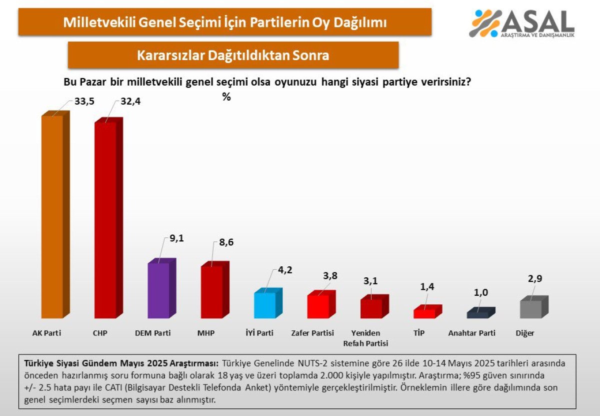 Asal Araştırma, 10-14 Mayıs arasında tüm Türkiye genelinde 2 bin kişiyle görüşerek bir seçim anketi yaptı.
