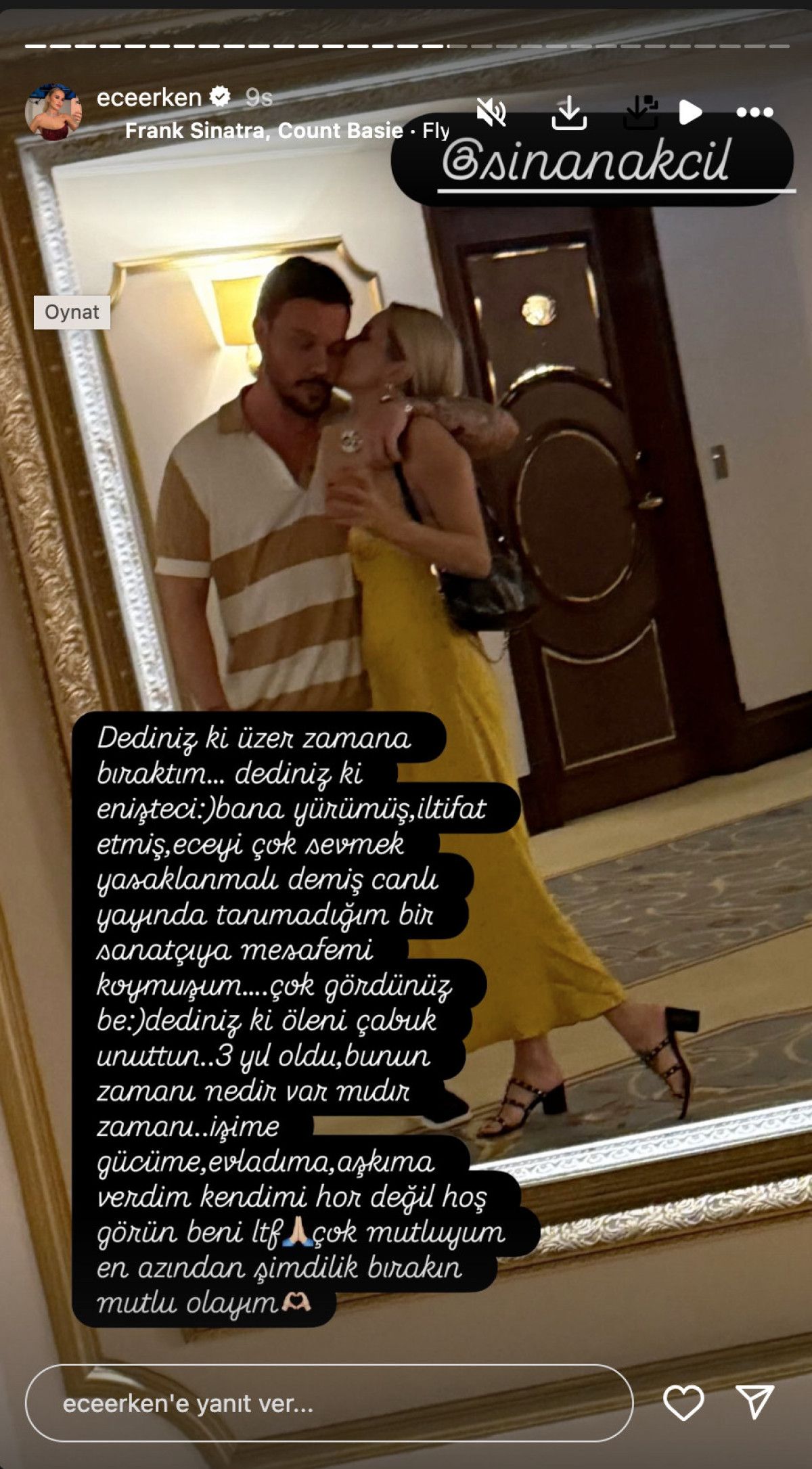 “Dediniz ki üzer zamana bıraktım. Dediniz ki enişteci. Bana yürümüş, iltifat etmiş, Ece’yi çok sevmek yasaklanmalı demiş canlı yayında tanımadığım bir sanatçı mesafemi koymuşum. Çok gördünüz be! Dediniz ki öleni çabuk unuttun. 3 yıl oldu, bunun zamanı nedir var mıdır zamanı? İşime gücüme, evladıma, aşkıma verdim kendimi hor değil hoş görün beni lütfen. Çok mutluyum en azından şimdilik bırakın mutlu olayım.”