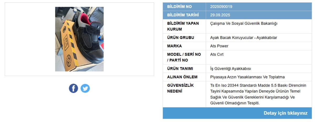 Yapılan resmi duyuruda, “Ats Power” markalı iş güvenliği ayakkabısının temel sağlık ve güvenlik standartlarını karşılamadığı açıklandı.