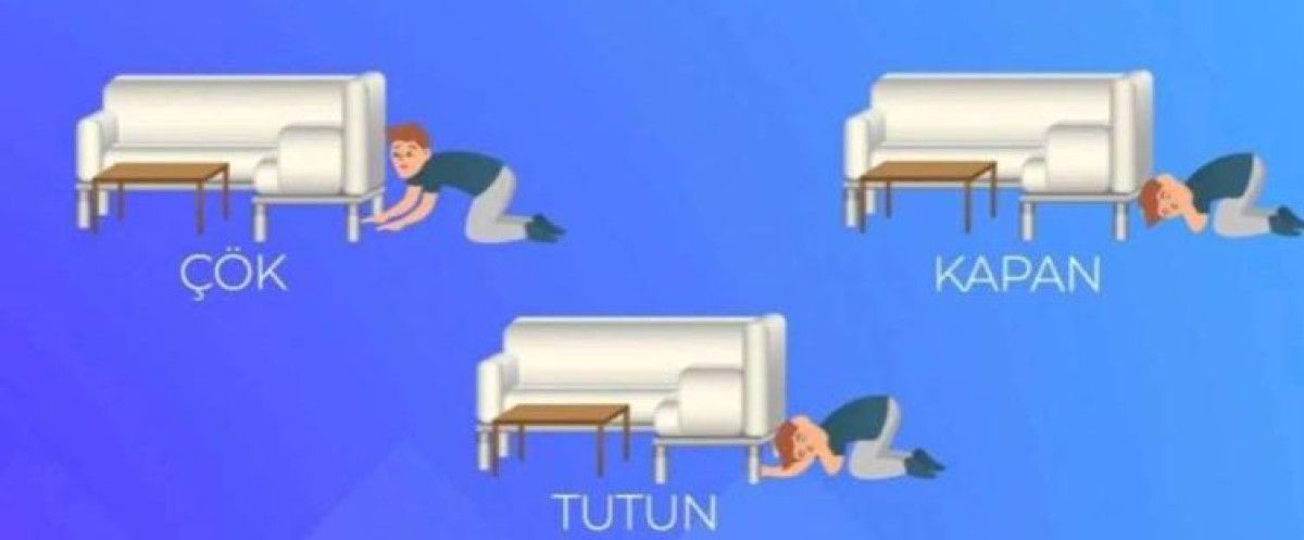Sabitlenmemiş dolap, raf, pencere gibi eşyaların yanından uzak durulması ve hayat üçgeni oluşturacak şekilde masa altı veya sağlam koltuk, kanepe yanına çömelmek hayati önem taşıyor.