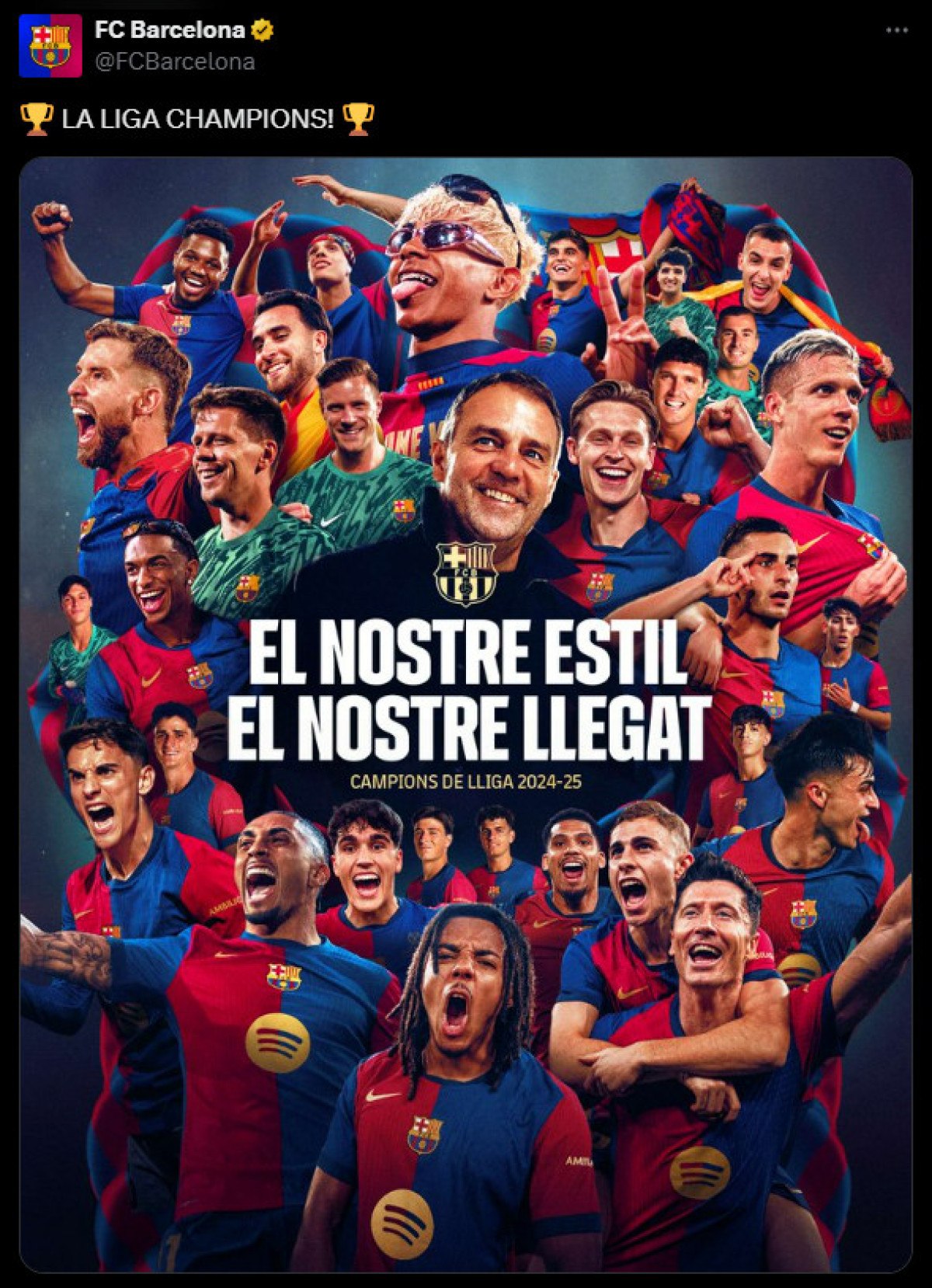 Bu galibiyetle puanını 85’e yükselten Barcelona, takipçisi Real Madrid ile arasındaki farkı 7’ye çıkararak bitime iki hafta kala şampiyonluğunu ilan etti. Espanyol ise 39 puanla 16. sırada yer aldı.