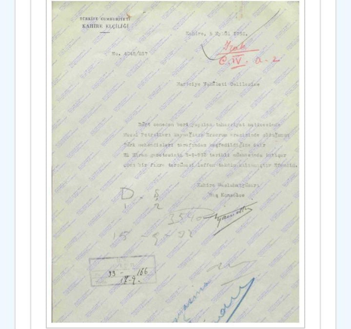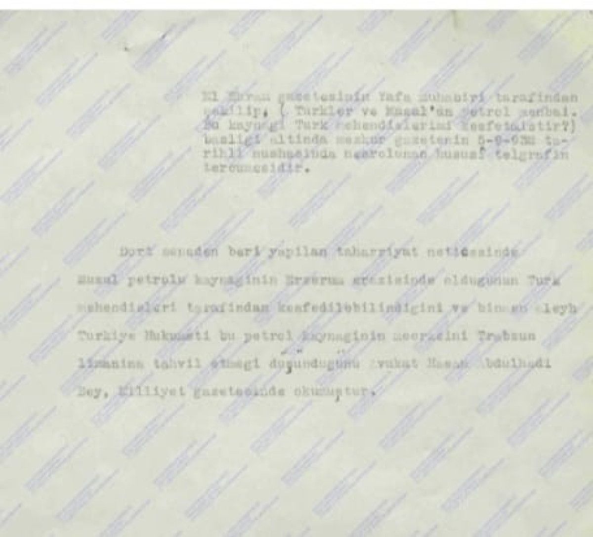 Belgeye göre, Musul petrollerini besleyen ana damarlar, Erzurum topraklarından başlıyor ve o dönemde Türk mühendisler tarafından tespit edilmişti.