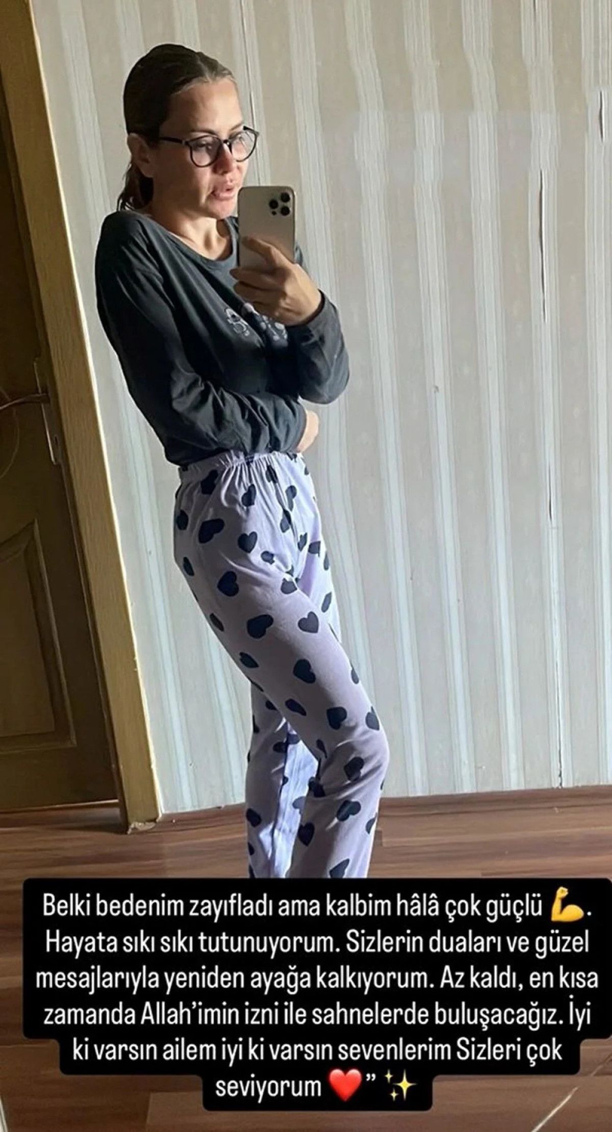 Belki bedenim zayıfladı ama kalbim hâlâ çok güçlü. Hayata sıkı sıkı tutunuyorum. Sizlerin duaları ve güzel mesajlarıyla yeniden ayağa kalkıyorum.