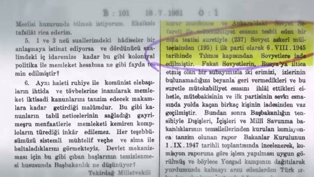 Doç. Dr. Karakulak, “1951 yılında Demokrat Parti Tekirdağ milletvekili Şevket Mocan, Meclis’e 195 Azerbaycan Türkü’nün iadesi süreciyle ilgili bir soru önergesi verdi. Ve bu soru önergesi neticesinde dönemin İçişleri Bakanlığı ve Adalet Bakanlığı buna bir cevaben yazı yazdı ve bu elim hadise kamuoyuyla paylaşılmak zorunda kalındı. TBMM zabıtları ve tutanakları sayesinde olayın detaylarına da vakıf olduk.” dedi.