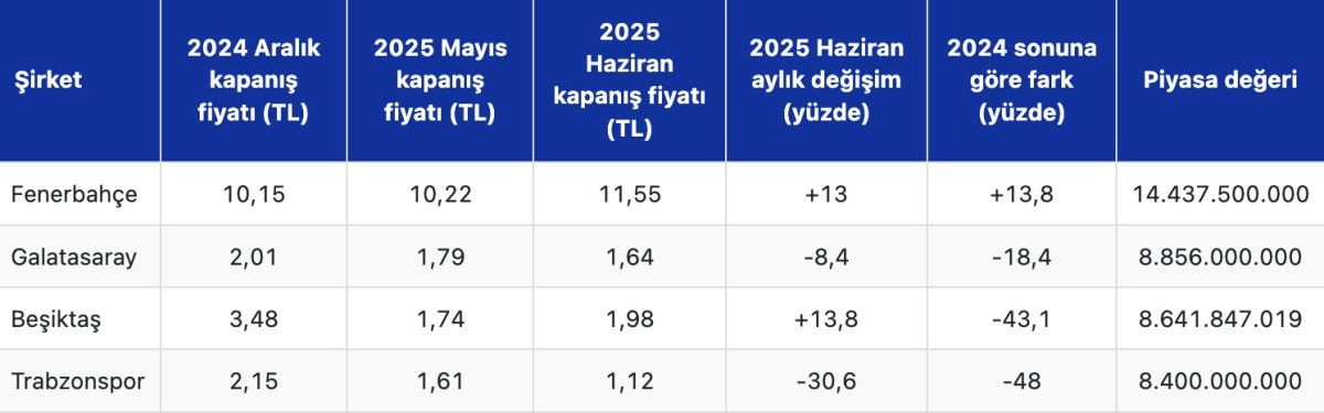 Borsada işlem gören 4 spor şirketinin Aralık 2024, Mayıs 2025 ve Haziran 2025 kapanış fiyatı, değişimi, 2024 sonuna göre farkı ve piyasa değeri şöyle: