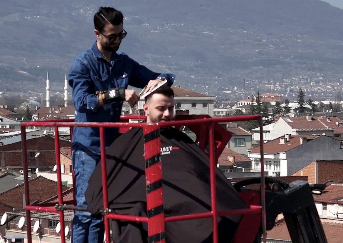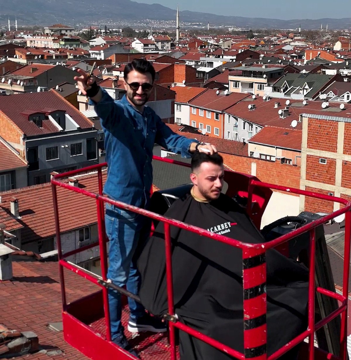 Acar, dükkanın önüne getirdiği vince bir müşterisini çıkararak 26 metre yükseklikte Uludağ manzarasına karşı tıraş yaptı.