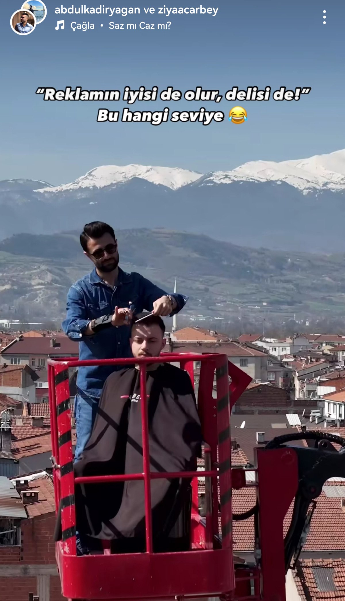 Amacının dikkat çekmek olduğunu söyleyen Ziya Acar, “Yerden 26 metre yüksekliğe çıkmak kolay olmadı. İlk başta saçma geliyordu, daha sonrasında yukarıda daha farklı bir hava olduğunu hissettik. Farklı bakış açısıyla, daha güzel görseller çıkarılabilirdi ama en güzelini çıkardık. 26 metre yükseklikte tıraş keyfi herkese nasip olmaz. Tavsiye ederiz.” diye konuştu.