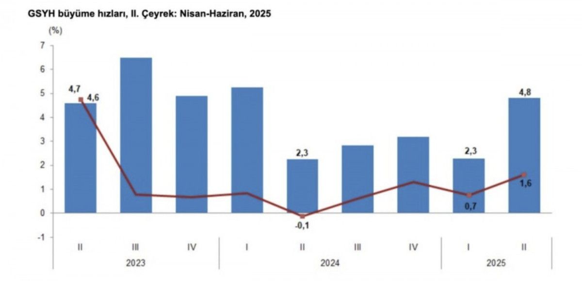 Gayrisafi Yurt İçi Hasıla (GSYH) 2025 yılı ikinci çeyrek ilk tahmini; zincirlenmiş hacim endeksi olarak, bir önceki yılın aynı çeyreğine göre yüzde 4,8 arttı.