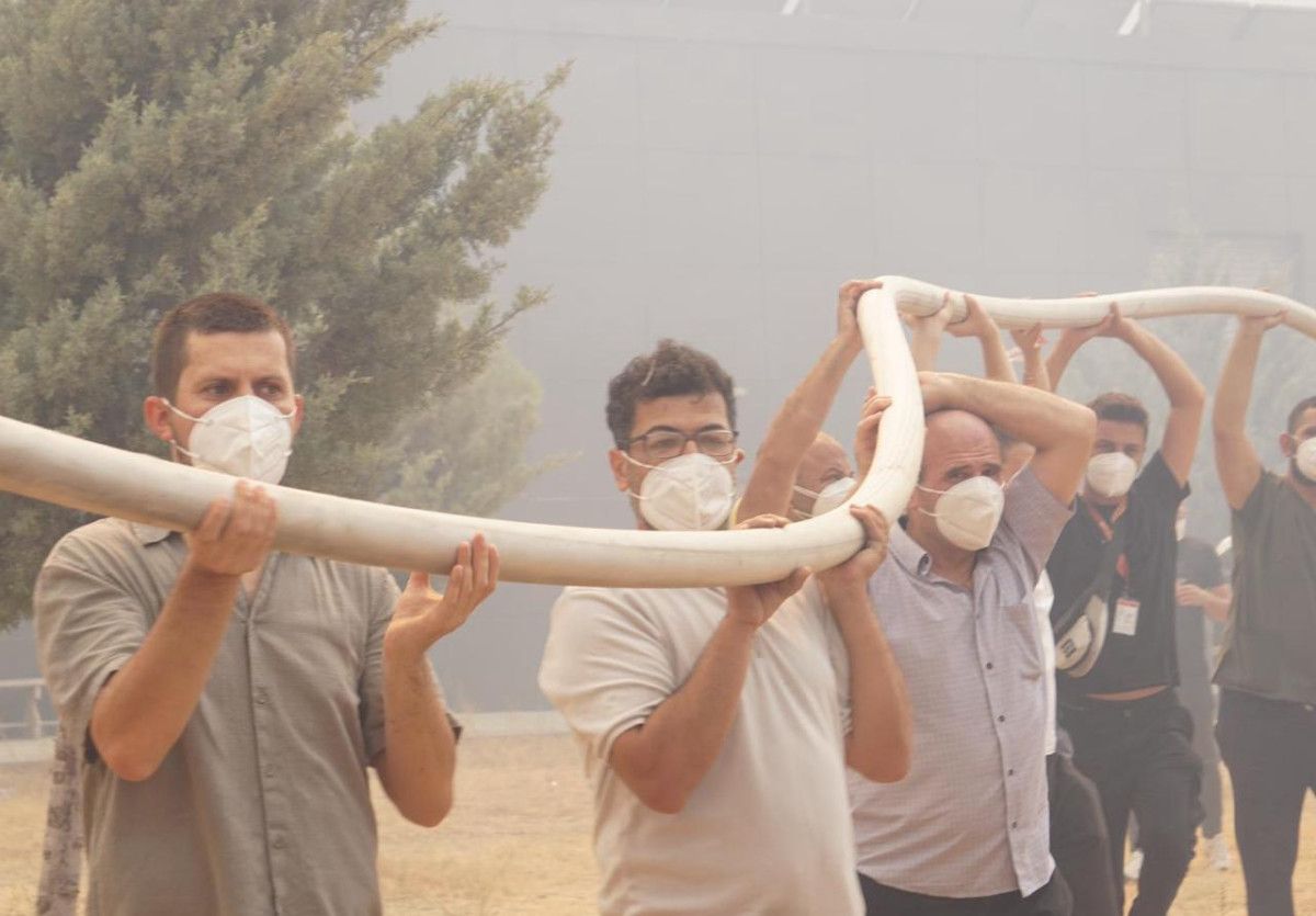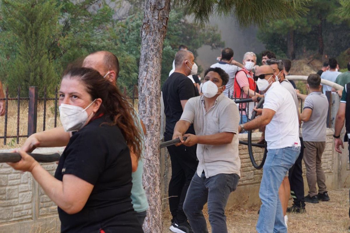 Çanakkale Mehmet Akif Ersoy Devlet Hastanesi personeli ve vatandaşlar, hastanenin önüne bağladıkları hortumla yangına müdahale ediyor.