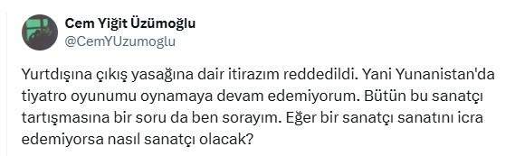 Yunanistan’da oynadığı oyununa gidemediğini belirten Üzümoğlu’nun açıklaması şöyle: “Yurt dışına çıkış yasağına dair itirazım reddedildi. Yani Yunanistan’da tiyatro oyunumu oynamaya devam edemiyorum. Bütün bu sanatçı tartışmasına bir soru da ben sorayım. Eğer bir sanatçı sanatını icra edemiyorsa nasıl sanatçı olacak?”