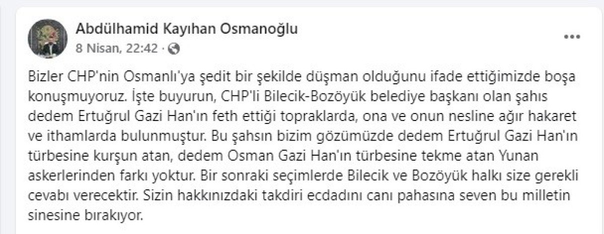 II. Abdülhamit Han’ın torunu Abdülhamit Kayıhan Osmanoğlu, Bozüyük Belediye Başkanı’na sert bir şekilde karşılık verdi. Osmanoğlu, Bakkalcıoğlu’nun açıklamalarına “Bu şahsın, bizim gözümüzde dedem Ertuğrul Gazi Han’ın türbesine kurşun atan Yunan askerlerinden farkı yoktur” diyerek tepki gösterdi. Ayrıca, Bakkalcıoğlu’nu CHP’nin Osmanlı’ya olan düşmanlığına örnek göstererek, “Bilecik ve Bozüyük halkı size gerekli cevabı verecektir” dedi.