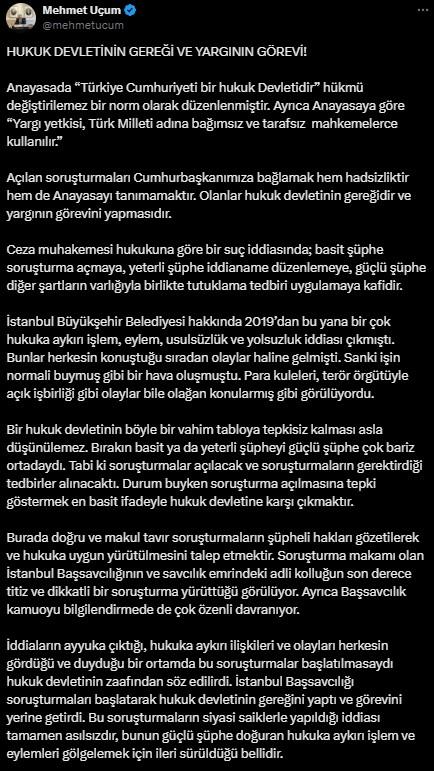 Cumhurbaşkanı Başdanışmanı Mehmet Uçum, İstanbul Büyükşehir Belediye Başkanı Ekrem İmamoğlu’nun gözaltına alınmasının ardından yaşanan gelişmelere ilişkin açıklama yaptı.