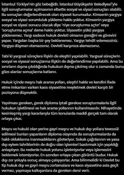 Tabii ki yargısal süreçlere ilişkin de eleştiri yapılabilir. Yargısal süreçlerin sosyal ve siyasal sonuçlarına ilişkin de değerlendirme yapılabilir. Ama bu sınırların dışına çıkıldığında hukukun dışına çıkılmış olur o zamanda bunu göze alanlar sonuçlarına katlanır. Hukuk içinde meşru hak arama yolları, eleştiri hakkı ve kendini ifade etme imkanları varken kaos siyasetine meyletmek devlet karşıtı bir pozisyona düşmektir. Yapılması gereken, gerek diploma iptali gerekse soruşturmalarla ilgili hukukun işletilmesi ve hak arama yollarının kullanılmasıdır. Nihayetinde kesinleşmiş yargı kararlarıyla tüm konularda maddi gerçek tam olarak ortaya çıkar.