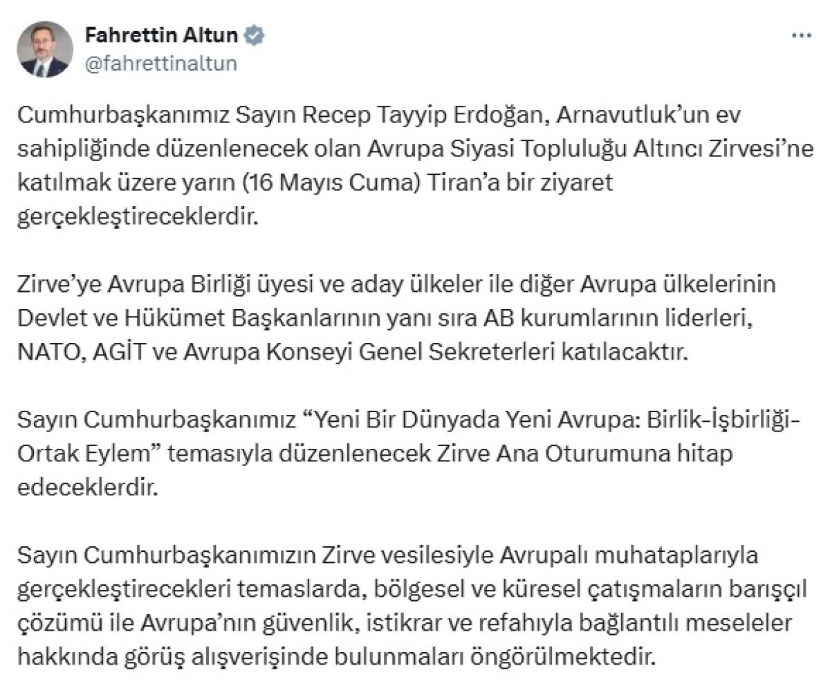 İletişim Başkanı Fahrettin Altun sosyal medya üzerinden yaptığı açıklamada, zirvenin Avrupa Birliği üyesi ve aday ülkeler ile diğer Avrupa ülkelerinin devlet ve hükümet başkanları, AB kurumlarının liderleri, NATO, AGİT ve Avrupa Konseyi Genel Sekreterleri gibi üst düzey katılımcıları bir araya getireceğini belirtti.