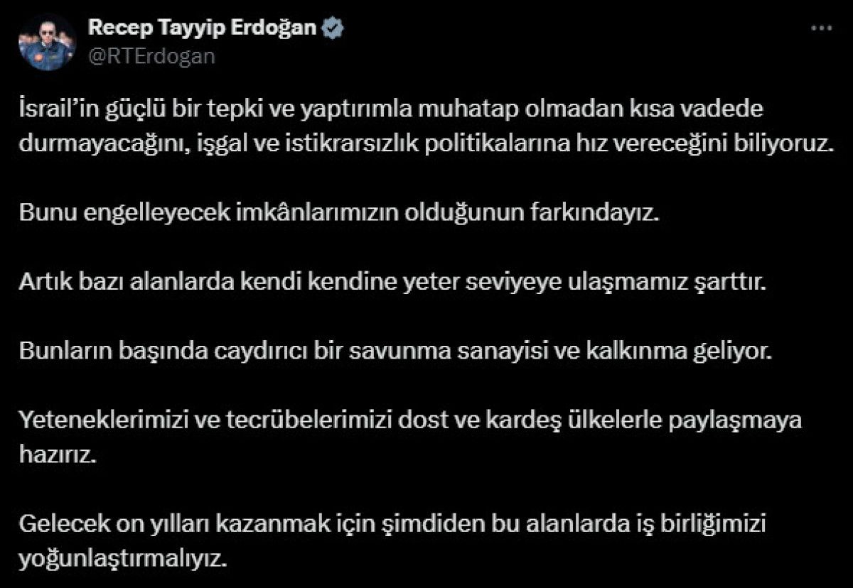 Katar’ın başkenti Doha’da gerçekleştirdiğimiz İslam İşbirliği Teşkilatı ve Arap Ligi Olağanüstü Zirvesi’nde aldığımız kararların İsrail tehdidini durdurmak için ilave adımlar atılmasına vesile olmasını, toplantımızın sonuçlarının harfiyen takip edilmesini temenni ediyorum.