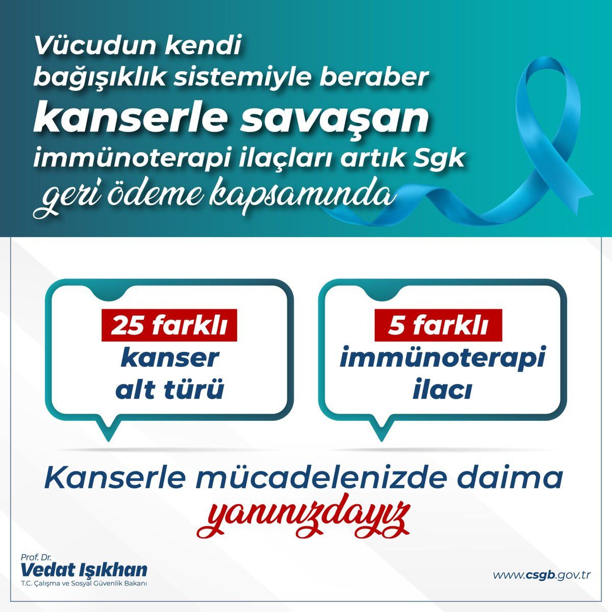 Önemli immünoterapi ilaçları Sosyal Güvenlik Kurumu geri ödeme listesine alındı. Bu hayati karar, tedavi süreçleri devam eden hastalarımıza umut olacaktır. Başta kanser tedavisi gören vatandaşlarımız olmak üzere herkese hayırlı olsun. Bu süreçteki güçlü işbirlikleri ve hassasiyetleri için Çalışma ve Sosyal Güvenlik Bakanımız Sayın Vedat Işıkhan ile Hazine ve Maliye Bakanımız Sayın Mehmet Şimşek’e gönülden teşekkür ediyorum.
