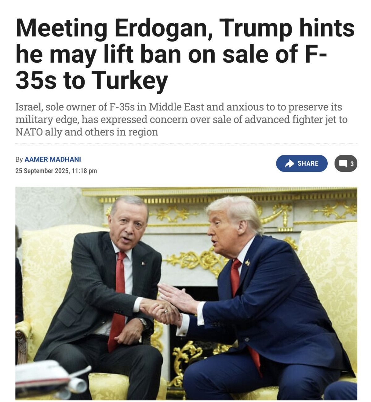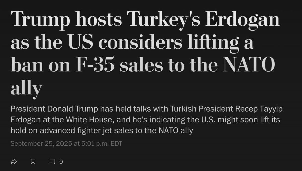 Haberin detaylarında; “Erdoğan’ın ziyareti öncesinde Trump, Erdoğan ile F-16’lar için önemli bir sözleşme ve F-35 programıyla ilgili görüşmeler de dahil olmak üzere çok sayıda ticari ve askeri anlaşmanın yakın olduğunu söylemişti” ifadeleri kullanıldı.