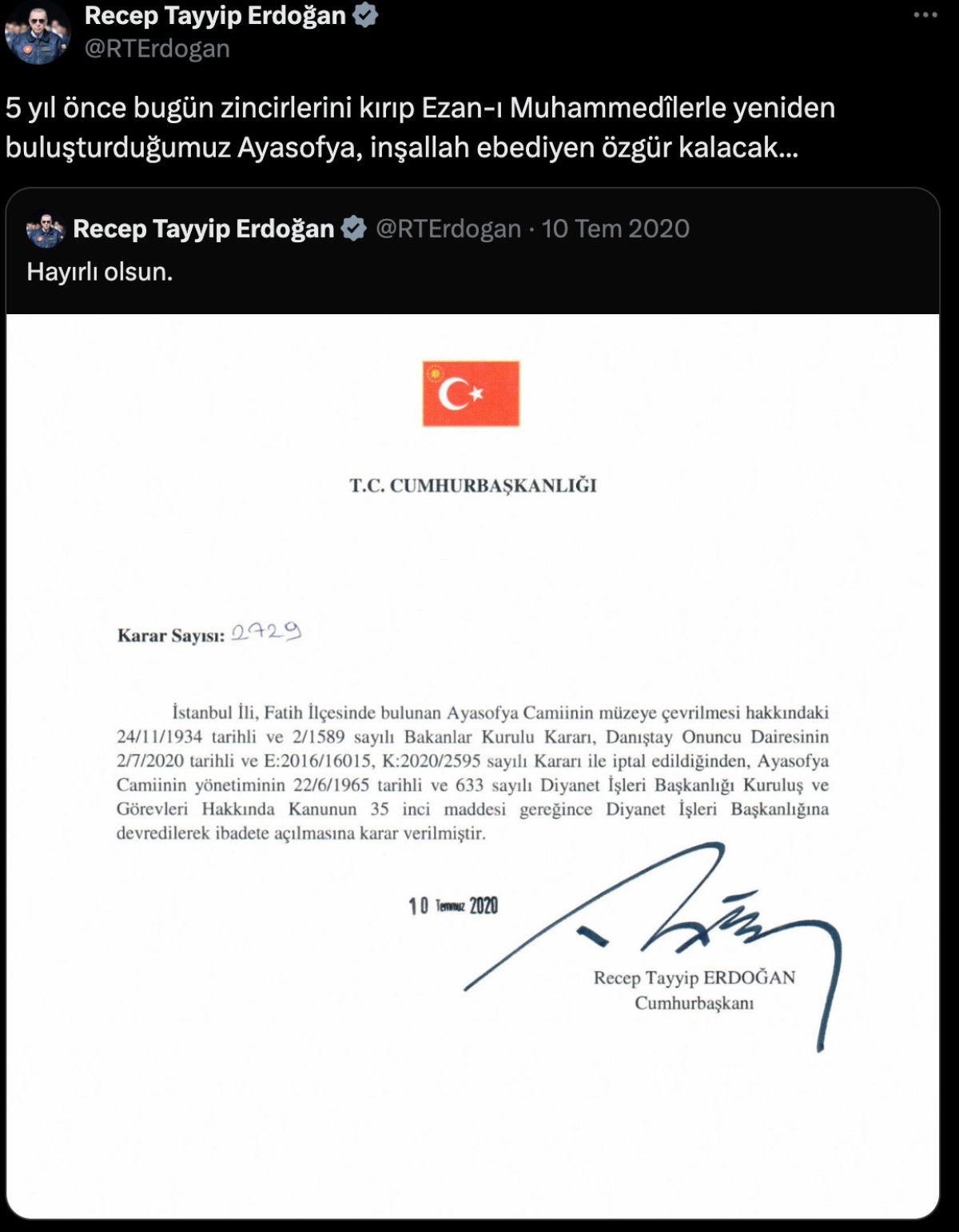 Cumhurbaşkanı Recep Tayyip Erdoğan, 10 Temmuz 2020 tarihinde attığı, Ayasofya’nın yeniden ibadete açılmasına yönelik kararnameye ilişkin paylaşımını alıntılayarak, şu ifadelere yer verdi: