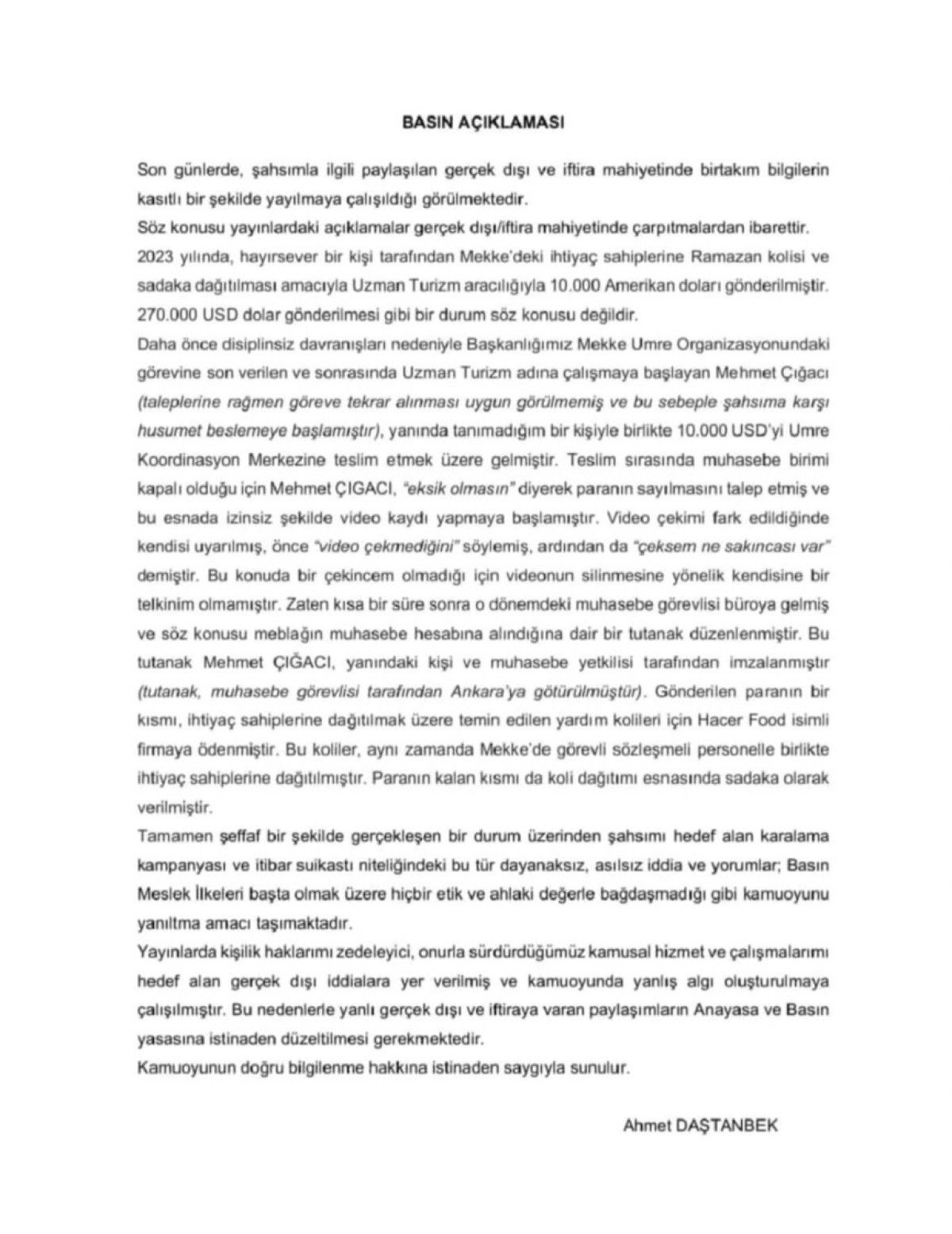 Söz konusu yayınlardaki açıklamalar gerçek dışı/iftira mahiyetinde çarpıtmalardan ibarettir. 2023 yılında hayırsever bir kişi tarafından Mekke’deki ihtiyaç sahiplerine Ramazan kolisi ve sadaka dağıtılması amacıyla Uzman Turizm aracılığıyla 10 bin Amerikan doları gönderilmiştir. 270 bin dolar gönderilmesi gibi bir durum söz konusu değildir.