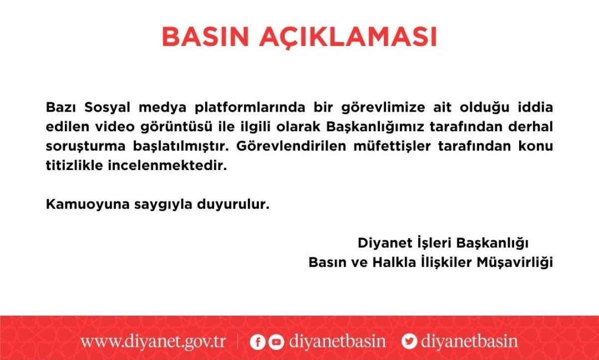 Videonun sosyal medya üzerinden yayılmasının ardından Diyanet İşleri Başkanlığı’nın resmi hesabından açıklama yapıldı.
