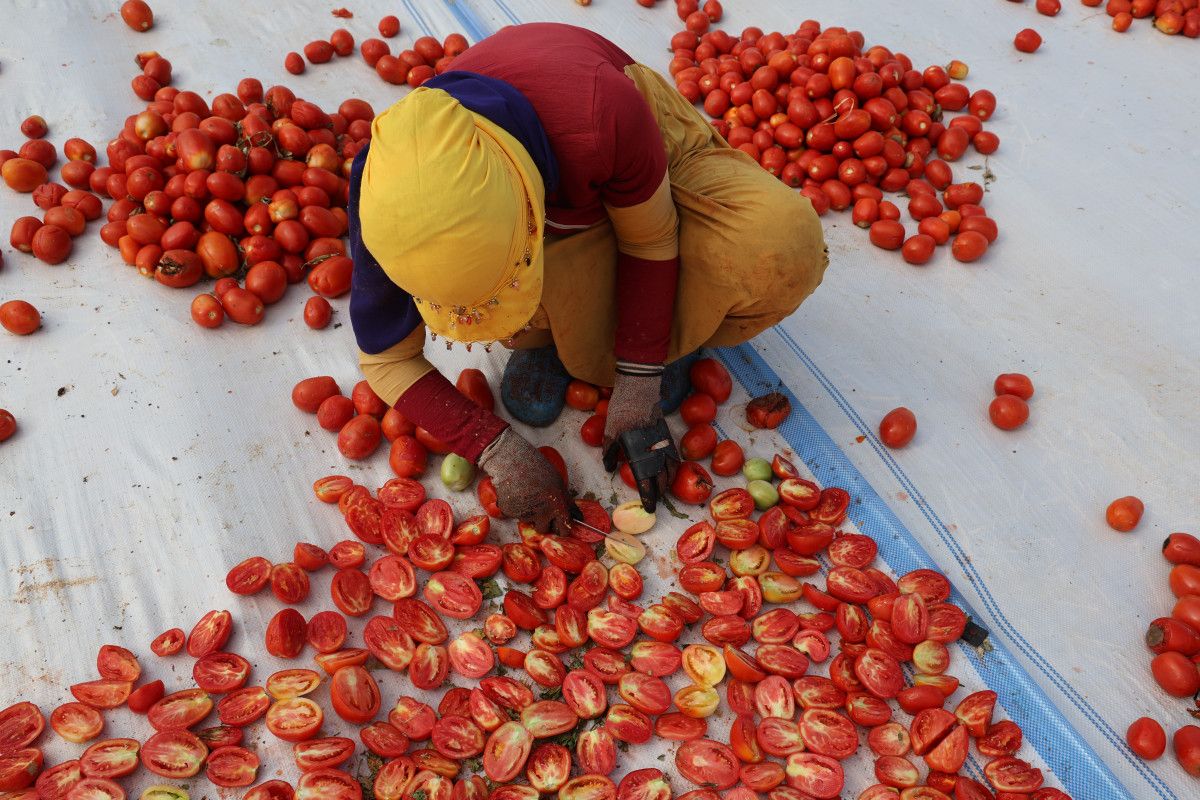 Hasat edilen ve alınan domatesler, işçiler tarafından serilen sentetik kumaş üzerine ikiye bölünüp tuzlanıyor.