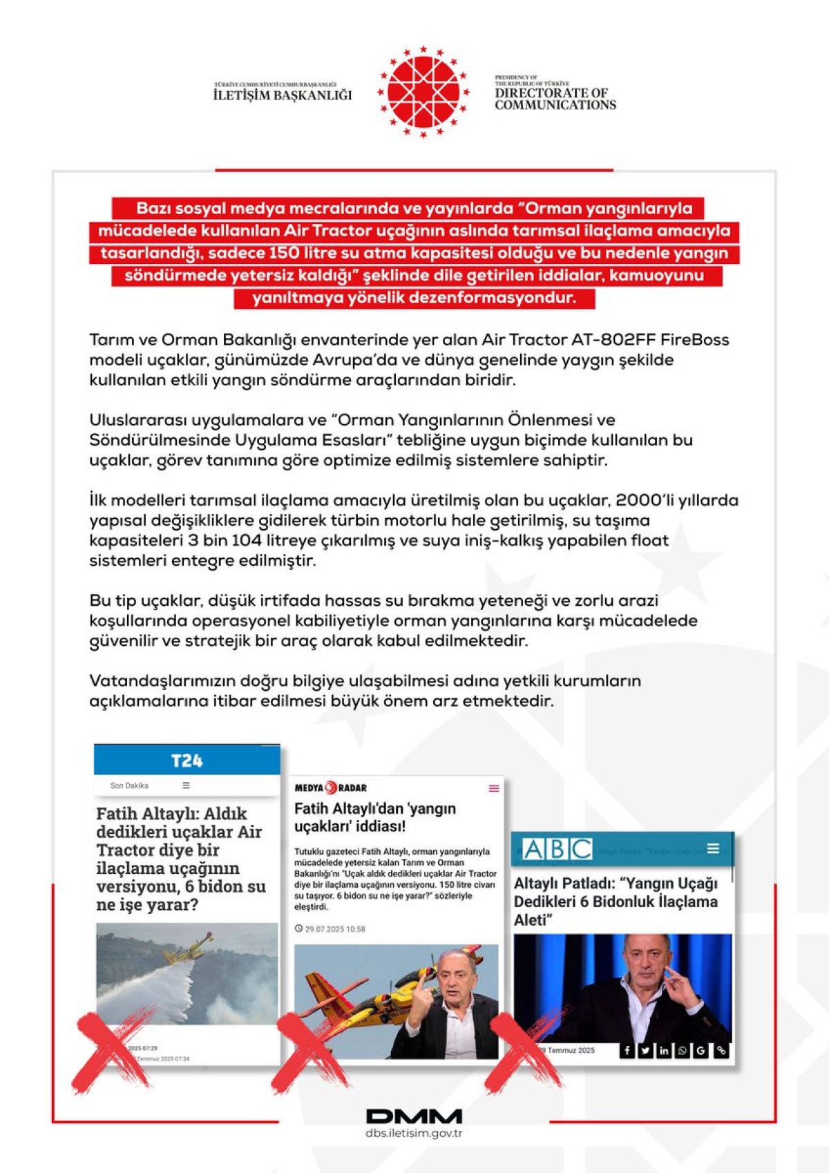 İktidarı hedef alan söylemleriyle bilinen ve geçtiğimiz ay Cumhurbaşkanına hakaret suçundan tutuklanan Fatih Altaylı, orman yangınlarıyla mücadelede kullanılan Air Tractor uçağının aslında tarımsal ilaçlama amacıyla tasarlandığı, sadece 150 litre su atma kapasitesi olduğu ve bu nedenle yangın söndürmede yetersiz kaldığı iddiasında bulundu.