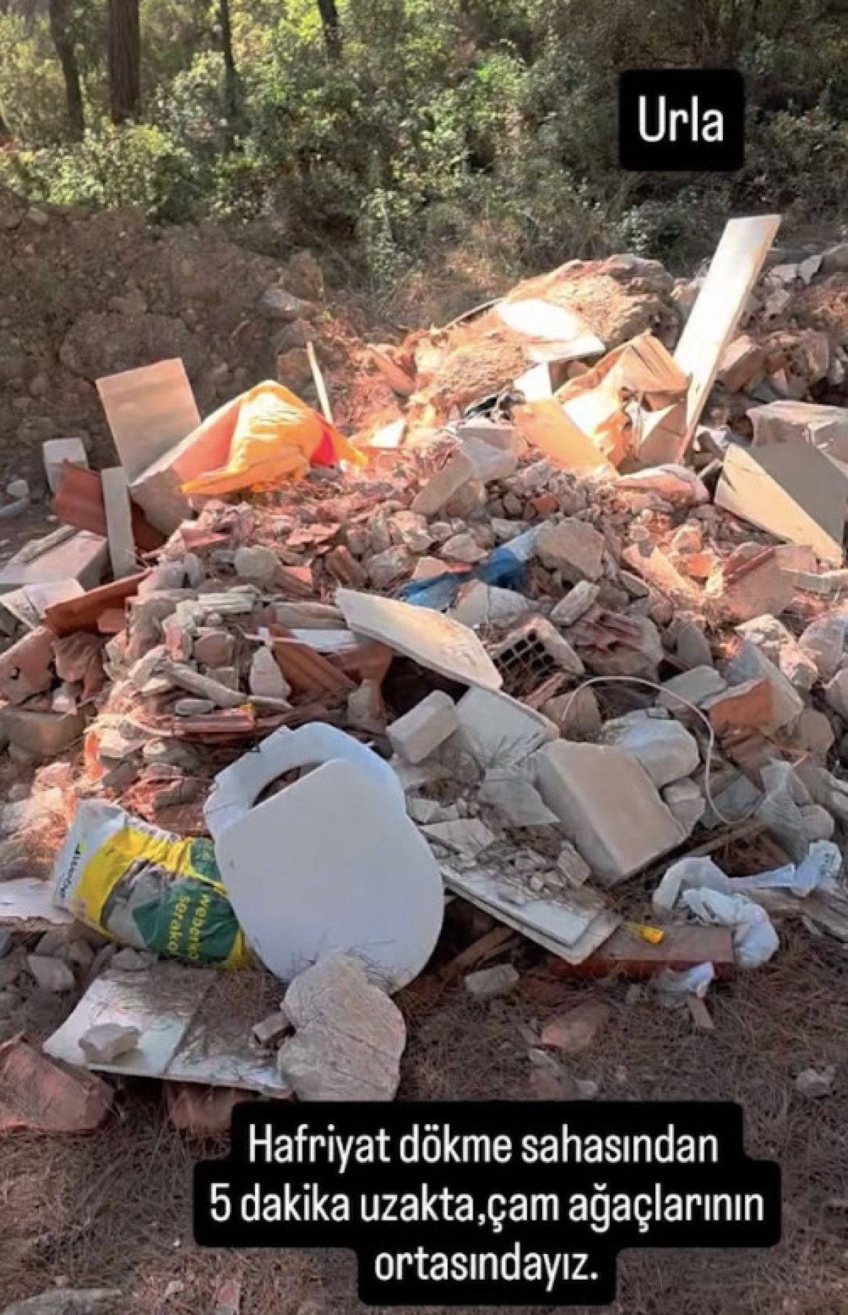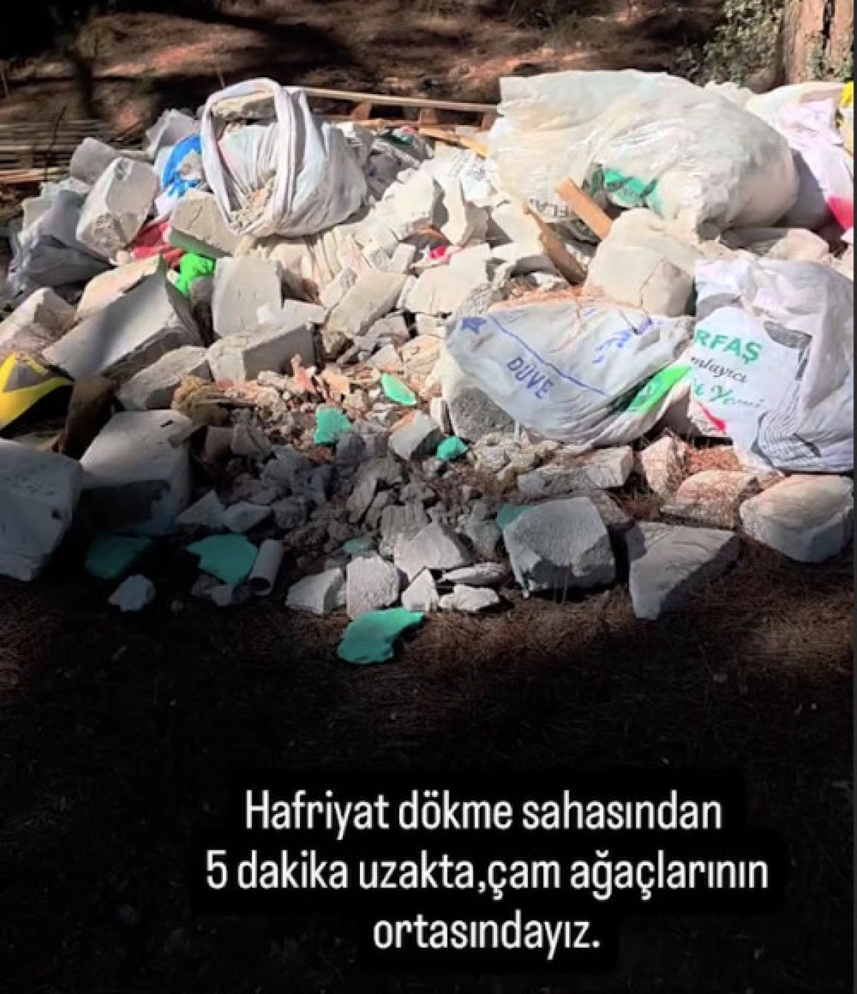 Her gün buraya moloz döküyorlar ve hemen ileride moloz dökme sahası var ama oraya gitmeyip buraya ormanın içine döküyorlar. Sonra orman yangınları neden çıktı? Ciğerlerimiz yandı. Çam ağaçlarının ortasındayız.