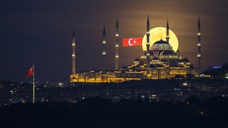Büyük Çamlıca Camii, dolunayın etkileyici ışıklarıyla aydınlanarak muazzam bir manzara oluşturdu. İstanbul’un simgelerinden biri olan camii, dolunayın parlak ışıklar altında büyüleyici bir şekilde yükseldi. Bu an, fotoğrafçılar ve doğa hayranları tarafından görüntülendi.