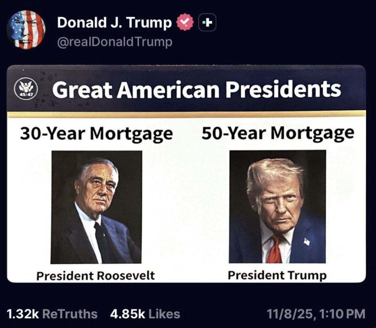 Trump ise Truth Social üzerinden yaptığı paylaşımda, 50 yıllık ipotek planını Franklin D. Roosevelt’in Yeni Düzen dönemindeki 30 yıllık ipotek standardına benzetti.