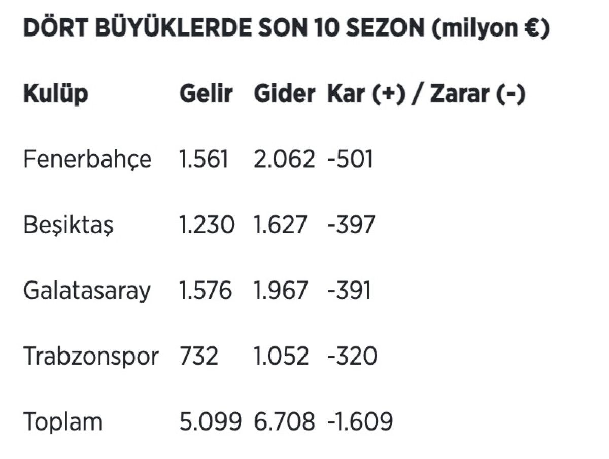 Diğer 9 sezonda zarara engel olamayan sarı-lacivertli kulüp, toplam 1 milyar 561 milyon euroluk gelir elde ederken kasasından 2 milyar 62 milyon euro çıktı.