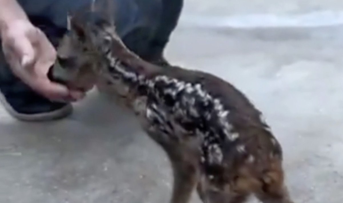 Yürümekte zorlanan yavru karacanın aç olduğunu düşünen polisler, süt alarak besledi.