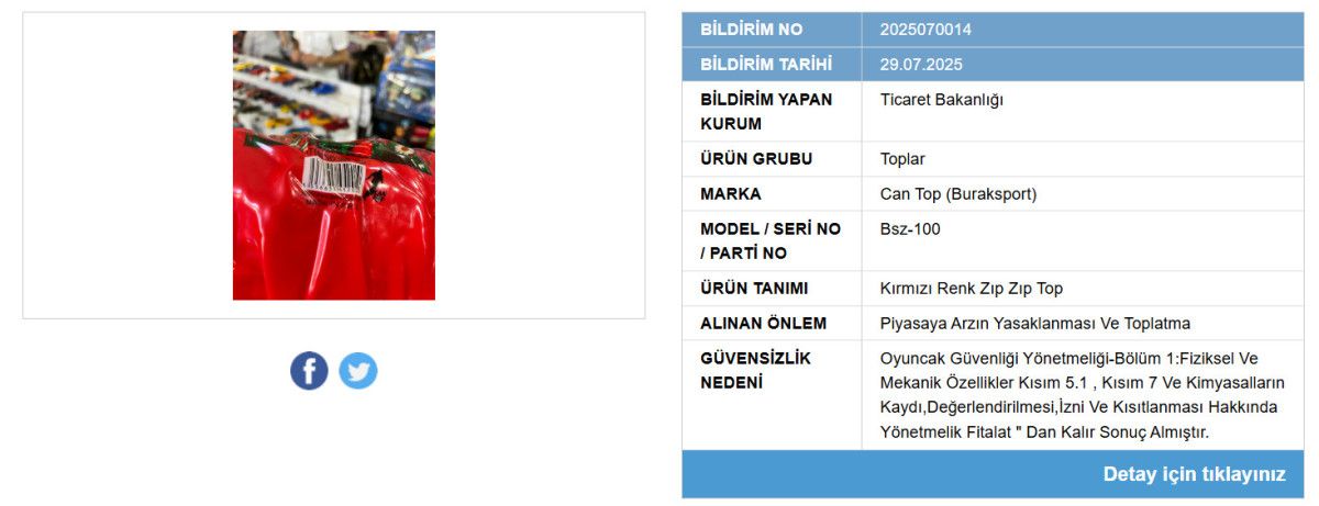 Çocuk sağlığı açısından risk oluşturan Burak Sport Oyuncak Hırdavat ve İnş. San. Tic. Ltd. Şti. tarafından ithal edilen ve Çin menşeli olan “Can Top” isimli ürünün hem fiziksel hem de kimyasal tehlikeler içerdiği tespit edildi.