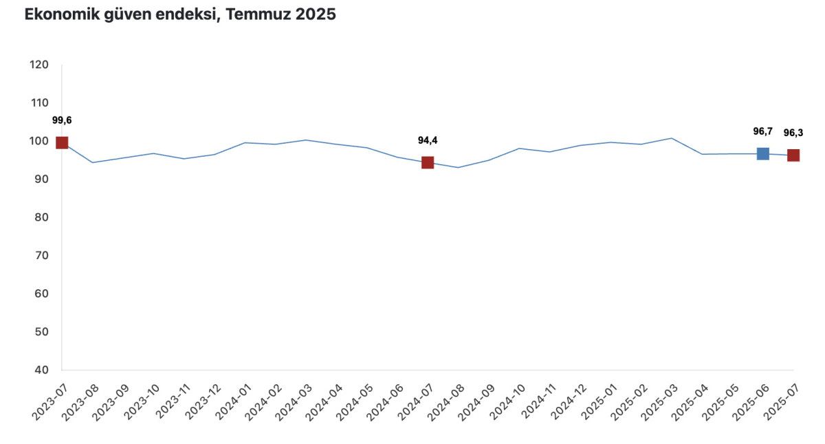Ekonomik güven endeksi haziran ayında 96,7 iken, temmuz ayında yüzde 0,4 oranında azalarak 96,3 değerini aldı.