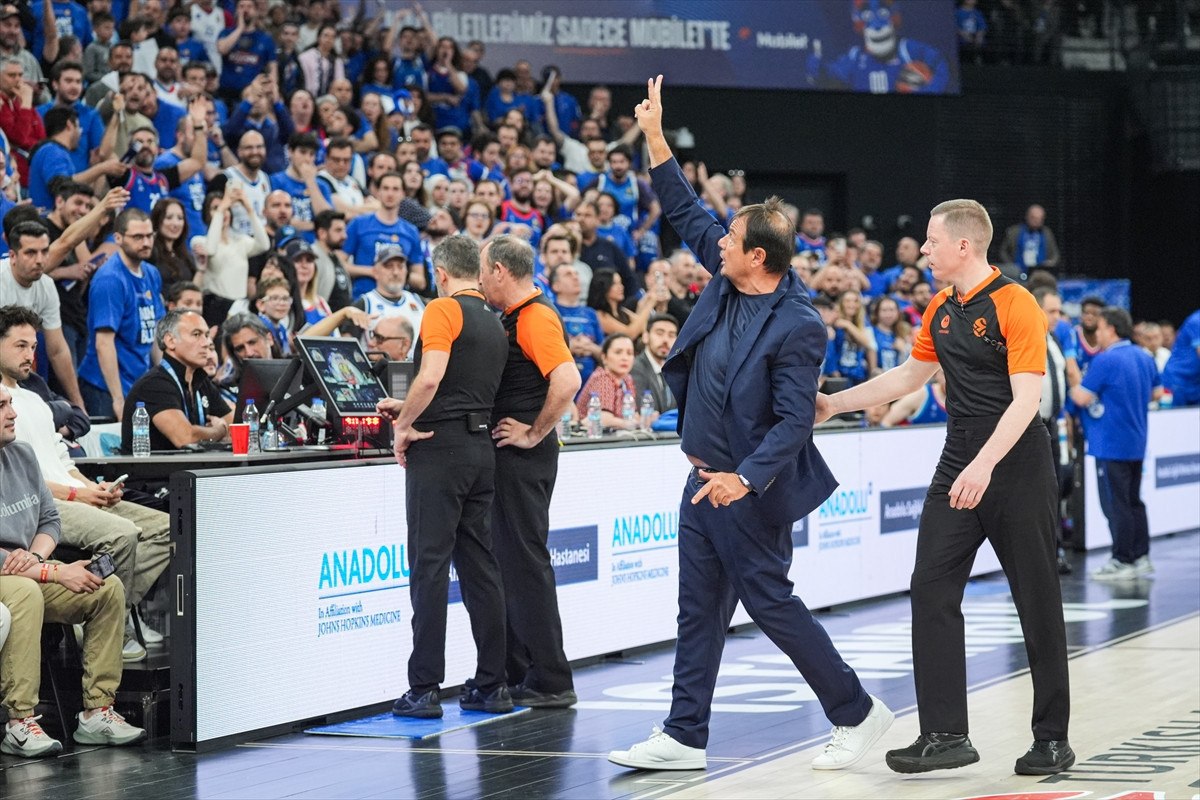 Maçın bitimine 16 saniye kala bir pozisyonun ardından hakemlerin inceleme yaptığı esnada tribünler Ergin Ataman’a yönelik, “Ergin Ataman mola alsana” şeklinde tezahüratlarda bulundu.