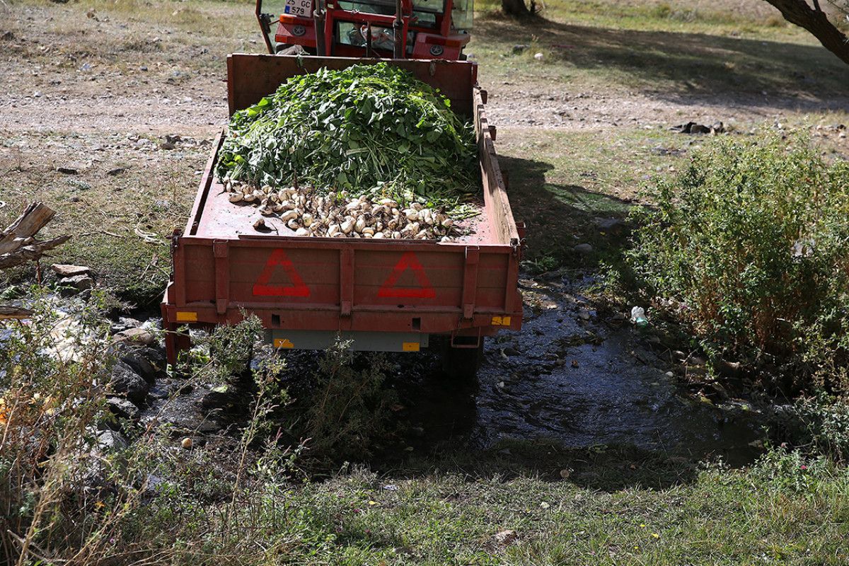 Tarladan sökülen şalgamlar önce sap ve yapraklarından ayrılıyor, ardından traktörlerle Çatalpınar Deresi’ne taşınıyor. Burada mahalleli, imece usulüyle ve türküler eşliğinde şalgamları yıkıyor.