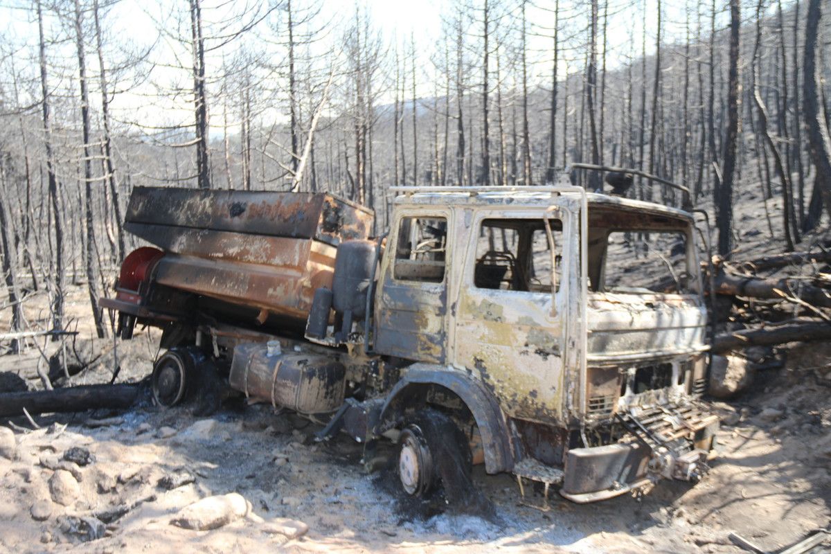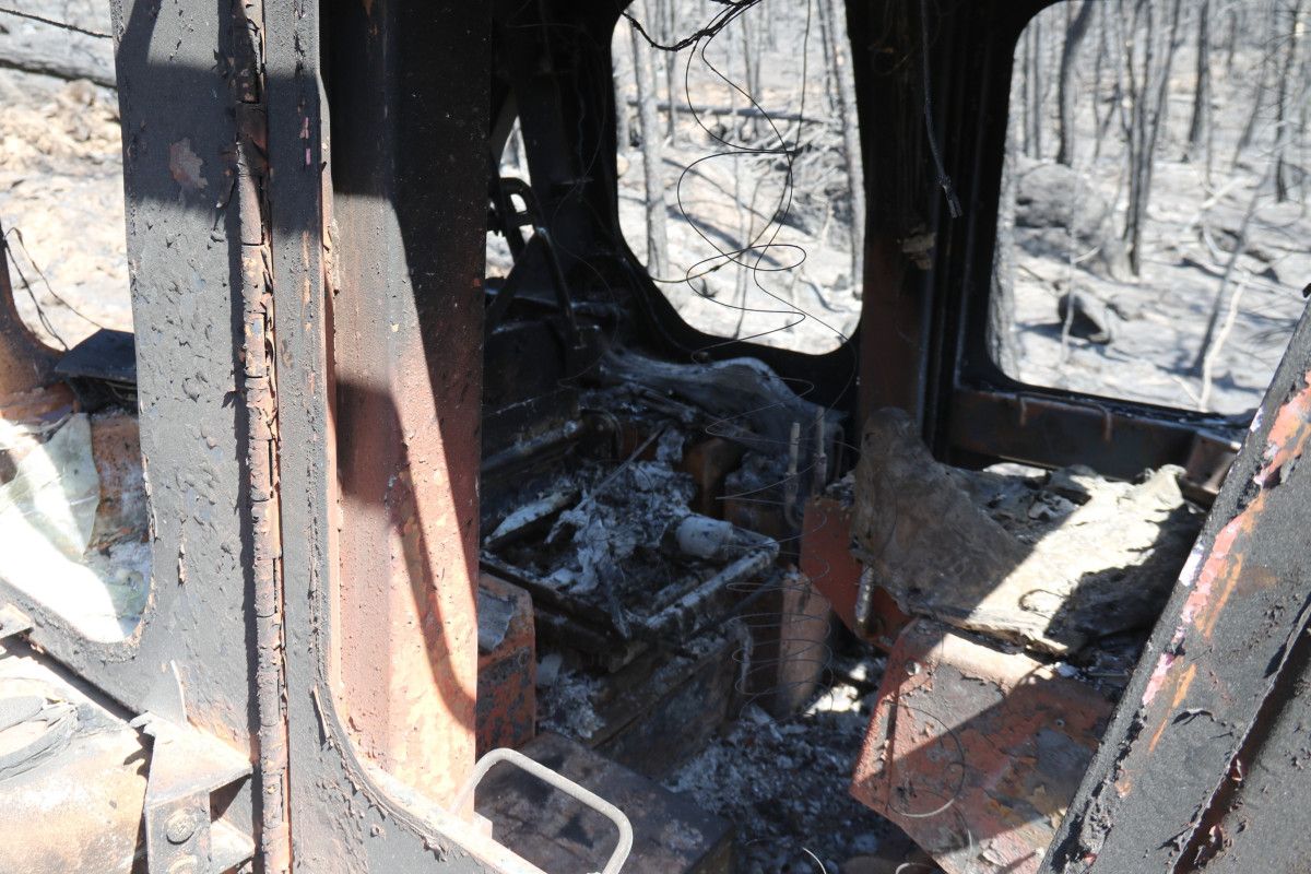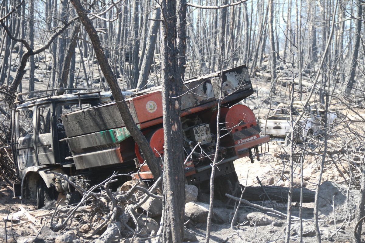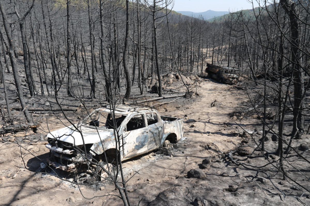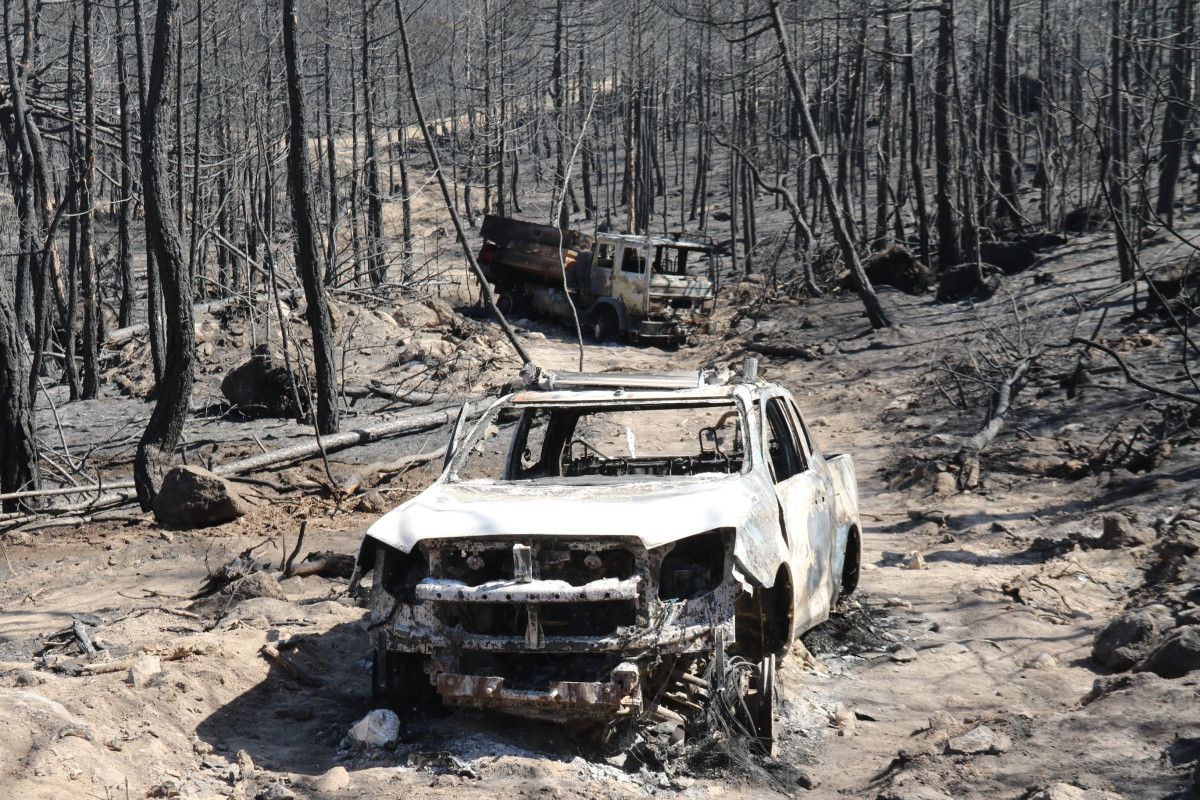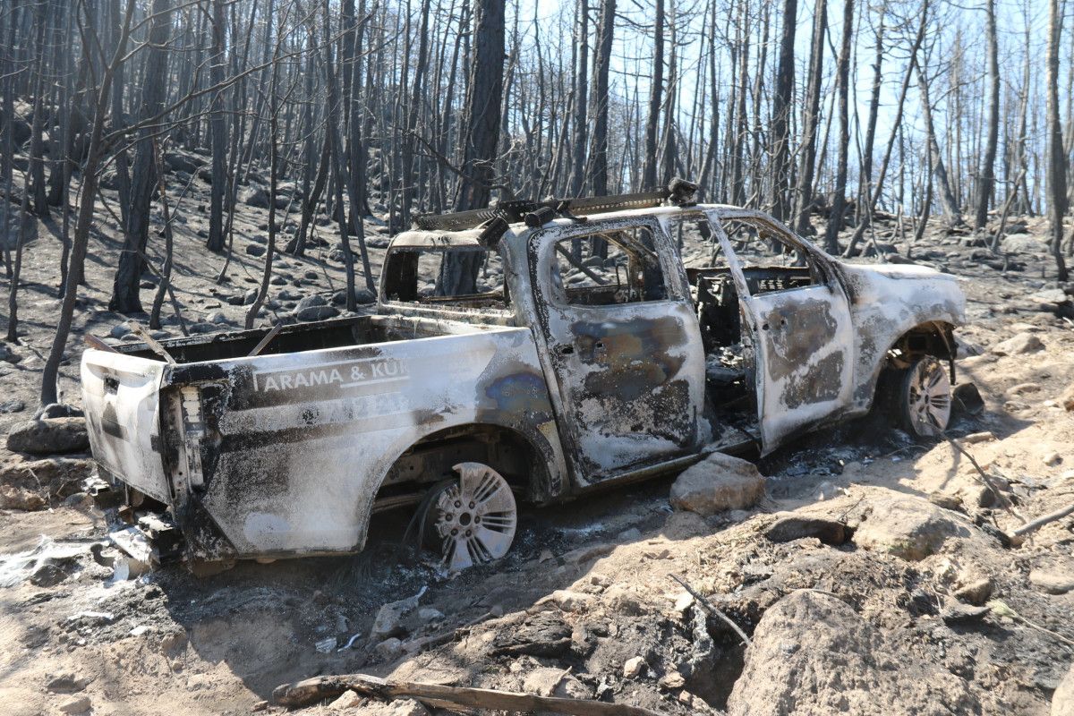 Geride kalan Eyüp Dereli’nin kullandığı dozer, Tolunay Kocaman’ın kullandığı arazöz ve AKUT ekibine ait pikap aracının demir yığınına dönmüş halleri yangının şiddetini bir kez daha gözler önüne serdi.