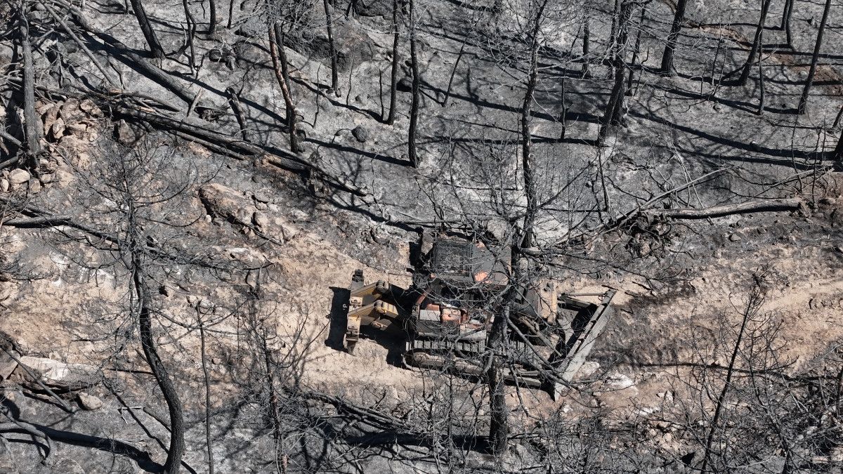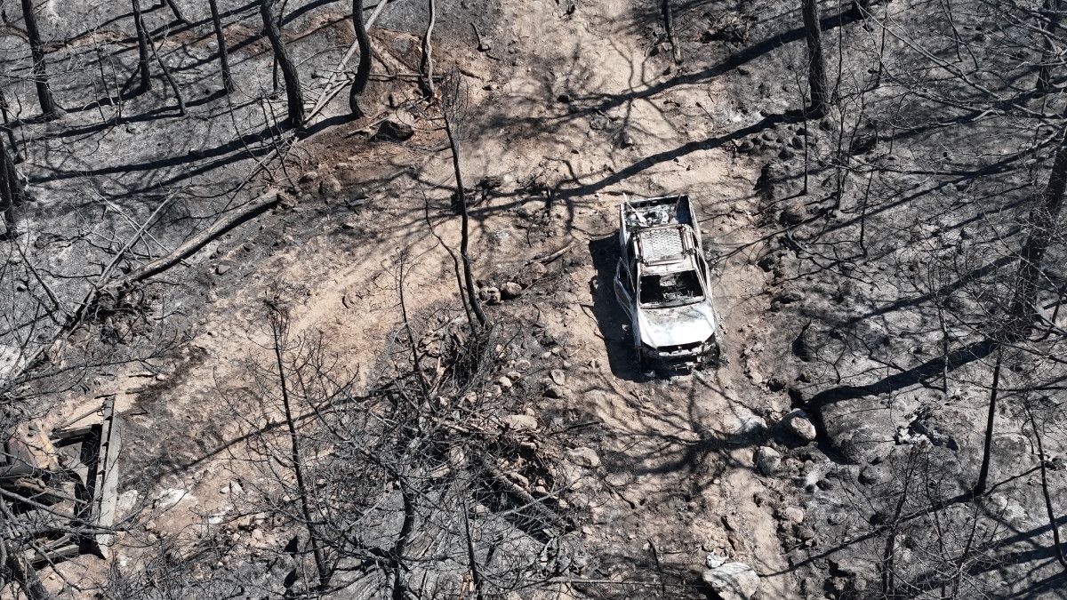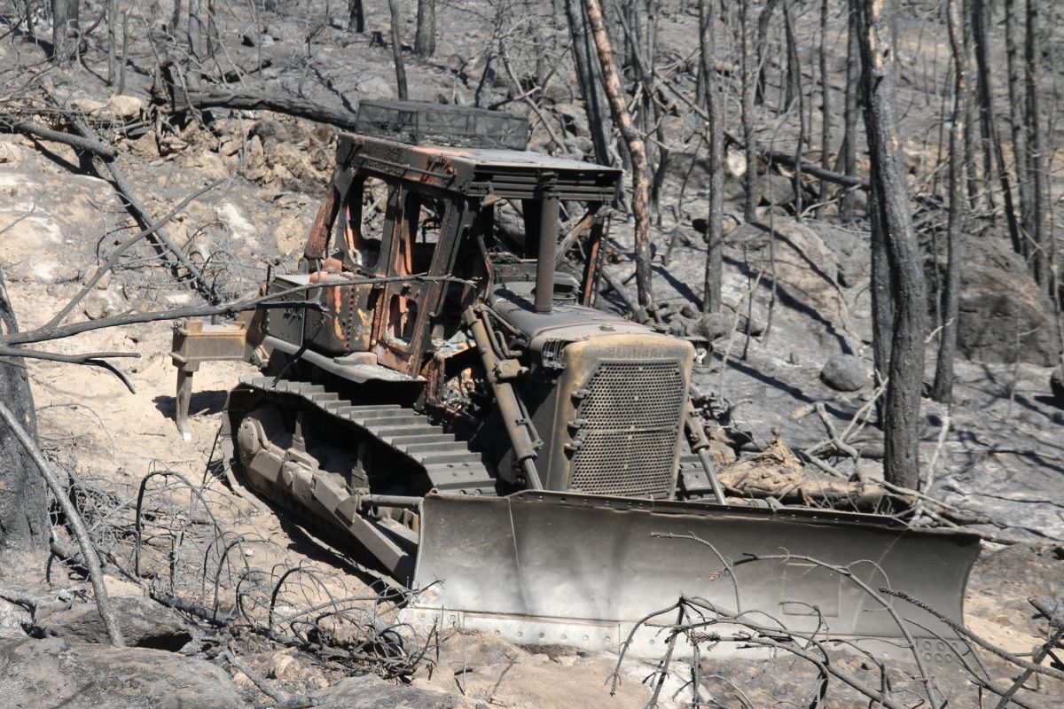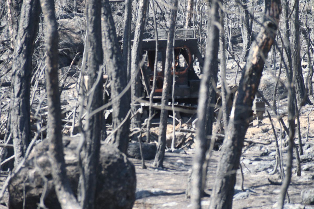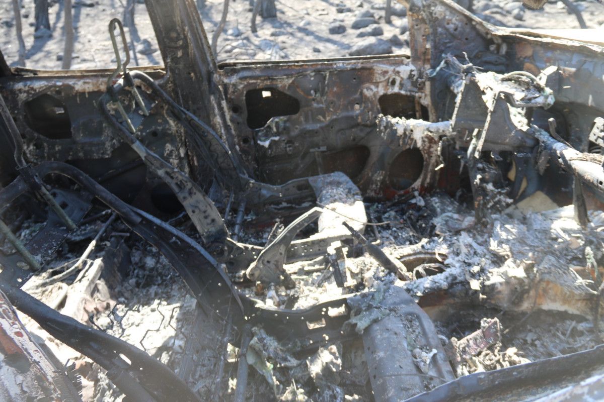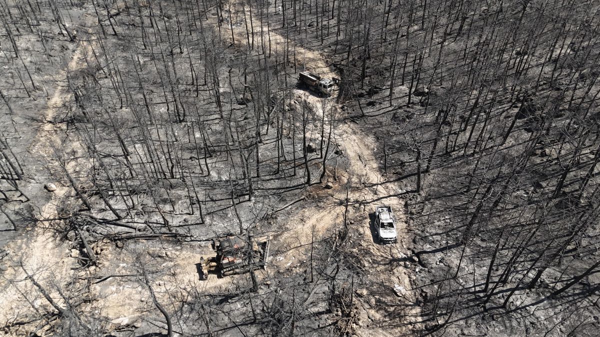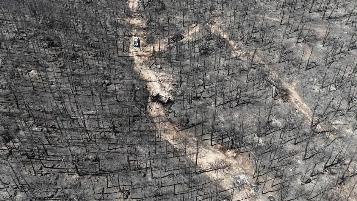 Geride kalan Eyüp Dereli’nin kullandığı dozer, Tolunay Kocaman’ın kullandığı arazöz ve AKUT ekibine ait pikap aracının demir yığınına dönmüş halleri yangının şiddetini bir kez daha gözler önüne serdi.